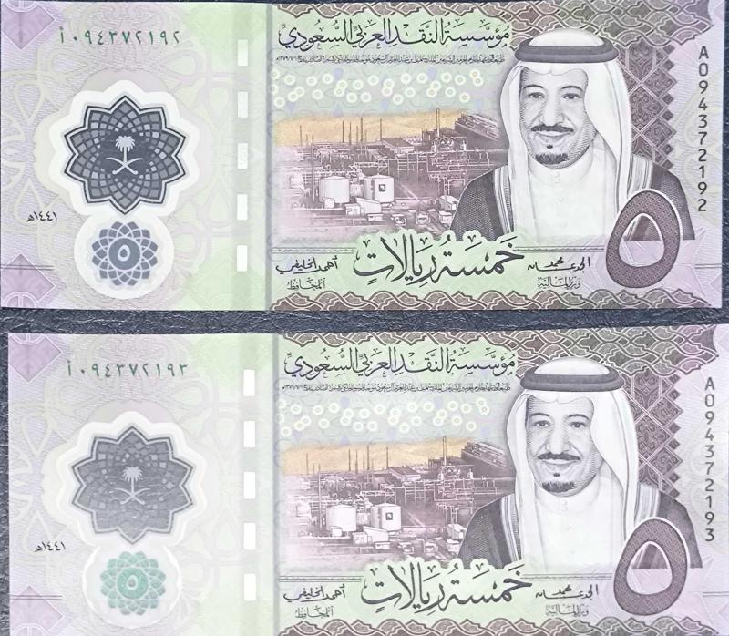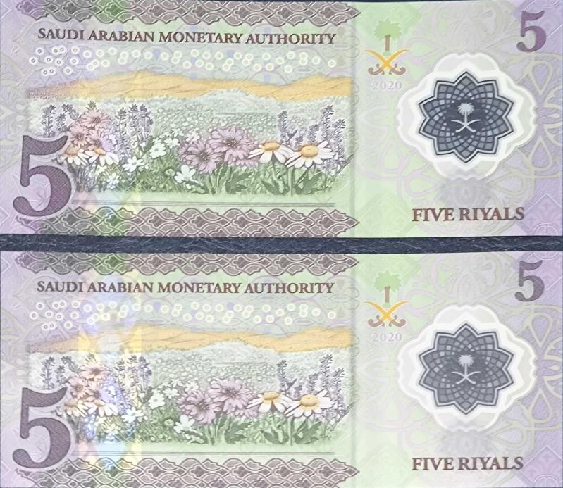 Suudi Arabistan 5 Rial polimer çil kondüsyonda Seri takipli kağıt para orjinaldir, 1 yıl önce satışa sunulmuştur.