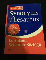 Synonyms Thesaurus EŞ ANLAMLI KELİMELER SÖZLÜĞÜ, ŞULE DÜNDAR tarafından kaleme alınmıştır. Kitap 2008 yılında ÖZGÜL YAYINLARI tarafından [İSTANBUL] yayınlanmıştır. 683 sayfadır. Synonyms Thesaurus EŞ ANLAMLI KELİMELER SÖZLÜĞÜ adlı eser Türkçe dilindedir. Eserin içeriğinde İngilizce dilinde bölümlere de yer verilmektedir.