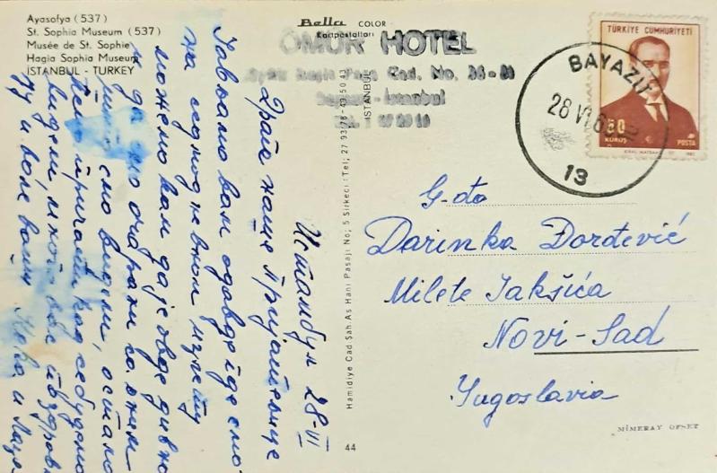 T.C. İstanbul Ayasofya Kartpostal. Bayazıt damgalı 1968 Atatürk pullu, Ömür Otelleri kaşeli (Postadan geçmiş.) Yugoslavyaya gönderilmiş. Ürün görüldüğü gibidir.
