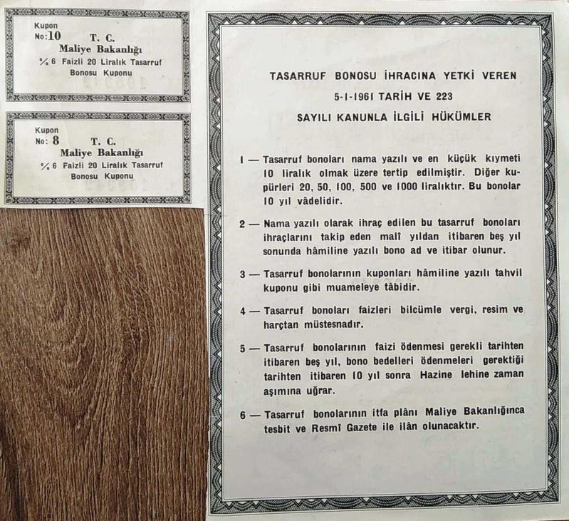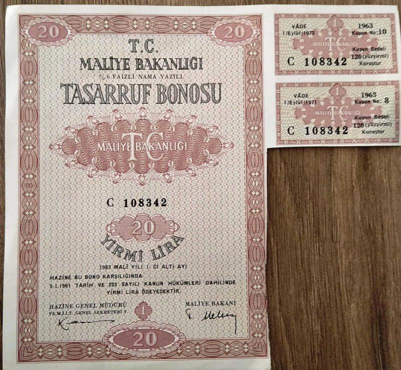 T.C. MALİYE BAKANLIĞI % 6 FAİZLİ NAMA YAZILI TASARRUF BONOSU 20 LİRA BEDELLİ C 108342 SERİ NUMARALI 1963/1973 SENESİ 120 KURUŞ BEDELLİ 2 KUPONLU
