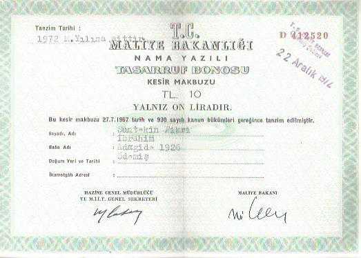 T.C. MALİYE BAKANLIĞI NAMA YAZILI TASARRUF BONOSU KESİR MAKBUZU 1972 - 10 LİRA, 6 yıl önce satışa sunulmuştur.