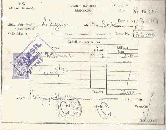 T.C. MALİYE BAKANLIĞI VERGİ DAİRESİ MAKBUZU 4/7/1977, en son 2 ay önce güncellenmiştir.