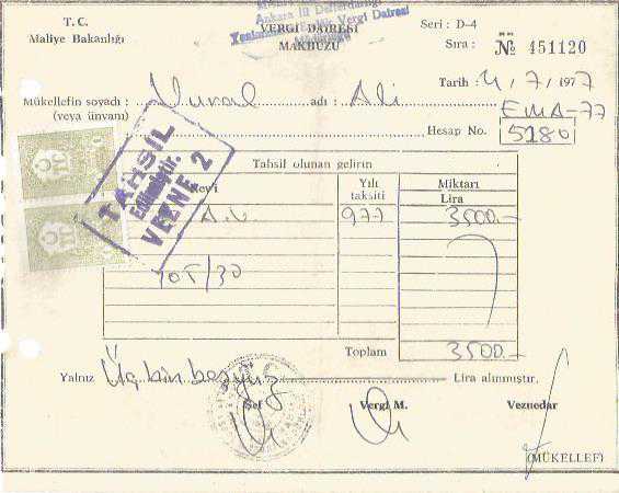 T.C. MALİYE BAKANLIĞI VERGİ DAİRESİ MÜDÜRLÜĞÜ- VERGİ DAİRESİ MAKBUZU - 4/7/1977, en son 2 ay önce güncellenmiştir.