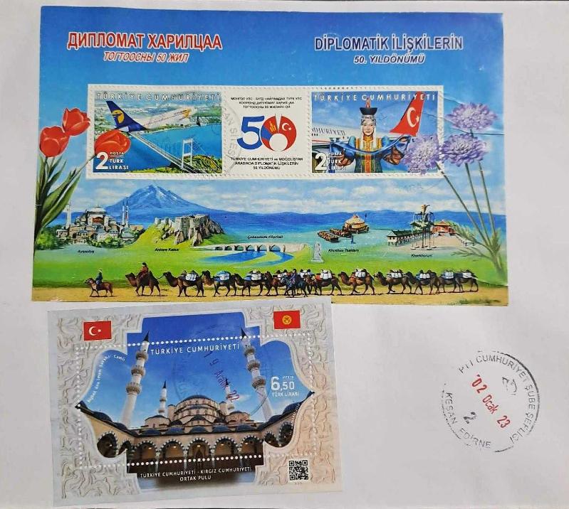 T.C. Moğolistan Arasında Diplomatik İlişkilerin 50.Yılı ve Türkiye - Kırgız Cumhuriyeti Ortak Pul bloğu ile postadan geçmiş ANKARA DAMGALI büyük ebat zarf. Varış damgalı.
