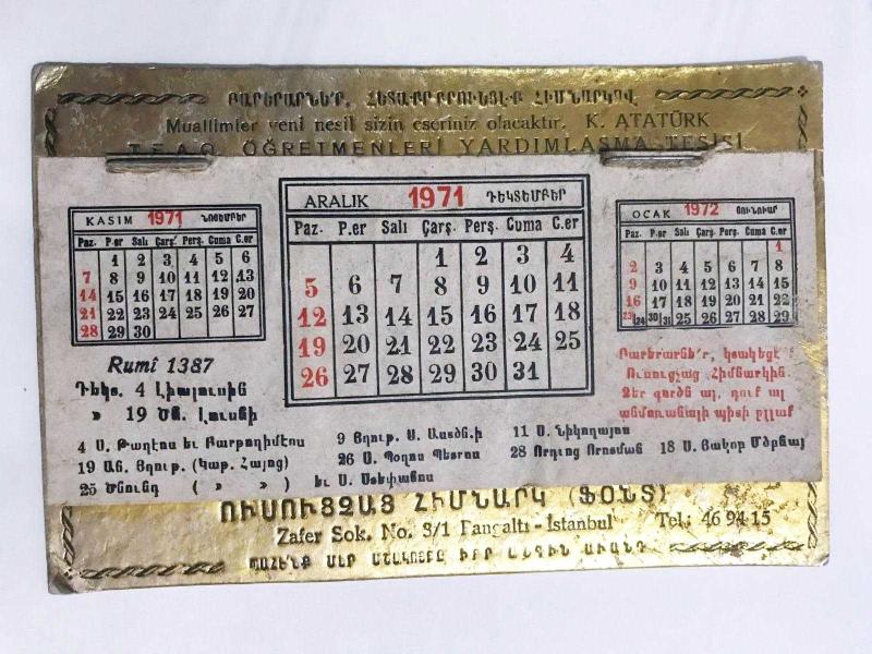 T.E.A.O. Öğretmenleri Yardımlaşma Vakfı - 1971 takvimi ( Sadece Aralık ayı sayfası mevcut), en son 1 yıl önce güncellenmiştir.