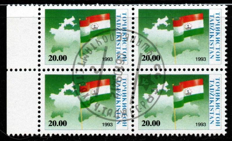TACİKİSTAN 8 Haziran1993 Bağımsızlık Günü :Tacikistan Bayrağı ve Haritası Postadan Geçmiş 06.09.94 tarihli Duşanbe Göbek Damgalı 20 Ruble 4 'lü Blok Pul Yeni bağımsız olan devletin sembollerini (bayrak ve ülke sınırları) gösteren en kritik pullardır.