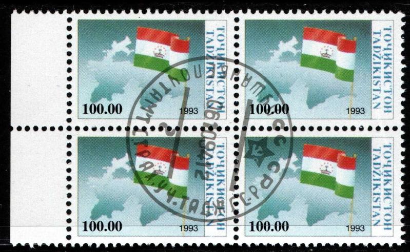 TACİKİSTAN 8 Haziran1993 Bağımsızlık Günü :Tacikistan Bayrağı ve Haritası Postadan Geçmiş 06.09.94 tarihli Duşanbe Göbek Damgalı 20 Ruble 4 'lü Blok Pul Yeni bağımsız olan devletin sembollerini (bayrak ve ülke sınırları) gösteren en kritik pullardır.