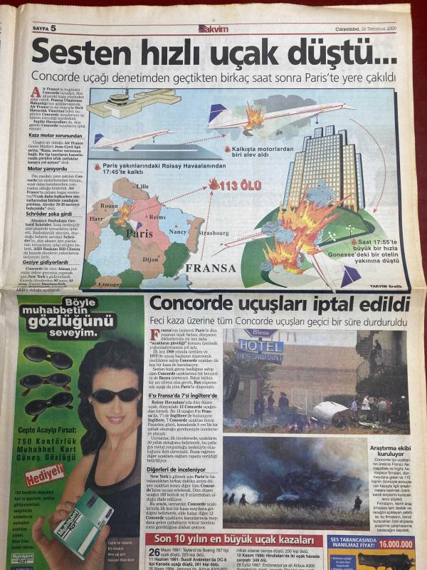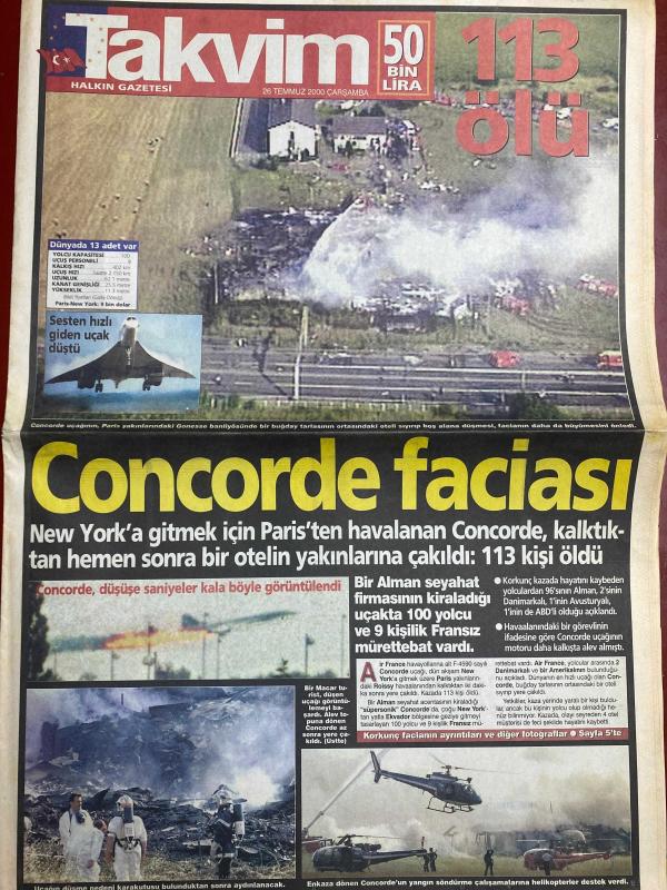 TAKVİM GAZETESİ DOĞUM GÜNÜ HEDİYESİ - 26 TEMMUZ 2000 -TAM TAKIM 16 SAYFADIR -Concorde-Balic-Hakan-Jardel-Oktay-Dürüst-Pope-Abdülkadir-Turgay Demir-Nouma-Stoilov-M.Yakın-Tayfun-Dimas-Abbas-Faruk Özçakın-Denizli-Gökhan-Tufan-Mehmet Ayaz-Mustafa Doğan-Ömer-Uche-Preko-Agassi-Michael Johnson-Serkan-İsmail Uygur-Taffarel 113 ölü-Concorde faciası-Sesten hızlı giden uçak düştü-Kartal bu kez kararlı-Şampiyonluk için geliyorum-Hakan cuma günü imzalıyor-20 milyarı geri ver-Jardel’den suçlama-Abdülkadir’den “sol” garantisi-Silahımız sabır-Stoilovlu Levski çok iddialı geldi-Fener pusuya yattı-Biyonik Mirkoviç-Üç genç yolcu-Terminötör Ömer-Yıllanmış şarap Uche-Kral dönüyor-Yine pres futbolu-Kaderi Münih’te belli olacak-Takımın ödülü 1 günlük izin-Çapkın-Birgi eşit şanstalar adlı eser Türkçe dilindedir.