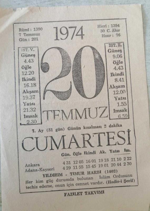 TAKVİM YAPRAĞI - 20 TEMMUZ 1974 CUMARTESİ(KOLEKSİYONLUK), en son 2 ay önce güncellenmiştir.