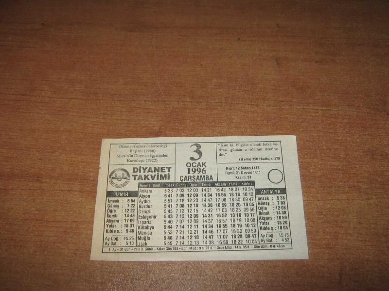 TAKVİM YAPRAĞI 3 OCAK 1996 DİYANET TAKVİMİ