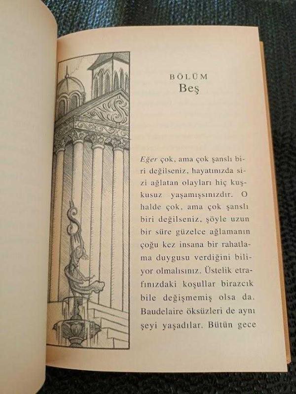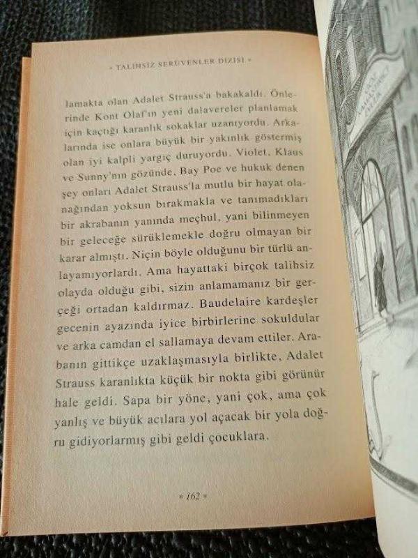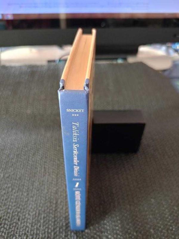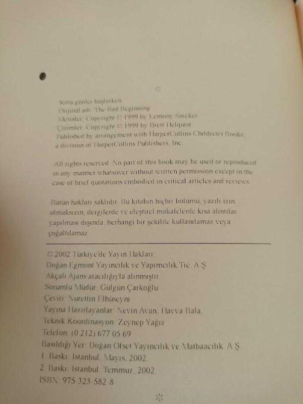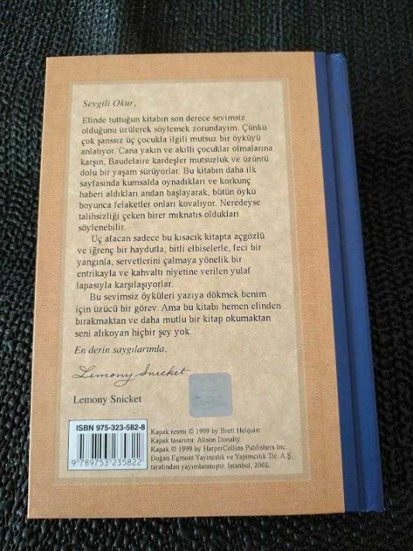 TALİHSİZ SERÜVENLER DİZİSİ - 1 KÖTÜ GÜNLER BAŞLARKEN. Cana yakın ve akıllı çocuklar olmalarına karşın, Baudelaire kardeşler mutsuzluk ve üzüntü dolu bir yaşam sürüyorlar. Bu kitabın daha ilk sayfasında kumsalda oynadıkları ve korkunç haberi aldıkları andan başlayarak, bütün öykü boyunca felaketler onları kovalıyor. Neredeyse talihsizliği çeken birer mıknatıs oldukları söylenebilir. Uç afacan sadece bu kısacık kitapta açgözlü ve iğrenç bir haydutla, bitli elbiselerle, feci bir yangınla, servetlerini çalmaya yönelik bir entrikayla ve kahvaltı niyetine verilen yulaf lapasıyla karşılaşıyorlar. Bu sevimsiz öyküleri yazıya dökmek benim için üzücü bir görev. Ama bu kitabı hemen elinden bırakmaktan ve daha mutlu bir kitap okumaktan seni alıkoyan hiçbir şey yok. En derin saygılarımla, Lemony Snicket Arka kapaktan alıntıdır. Yazar : Lemony Snicket Çeviri : Nurettin Elhüseyni Yayın Evi : Doğan Egmont Yayın Yılı ve Sayısı : 2002 / 2 Sayfa : 162 Durumu : Ciltli Yaşına göre çok iyi tertemiz yeni ayarında. Çekimden kaynaklı renk farkı oluşmaktadır.