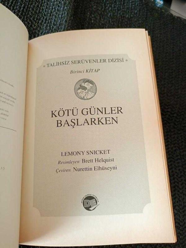 TALİHSİZ SERÜVENLER DİZİSİ - 1 KÖTÜ GÜNLER BAŞLARKEN., Lemony Snicket tarafından kaleme alınmıştır. Kitap 2002 yılında Doğan Egmont tarafından yayınlanmıştır. Satışta olan kitap, yayınevinin 2. baskısıdır. Bu baskının çevirisi Nurettin Elhüseyni tarafından yapılmıştır. 162 sayfadır. TALİHSİZ SERÜVENLER DİZİSİ - 1 KÖTÜ GÜNLER BAŞLARKEN. adlı eser Türkçe dilindedir.