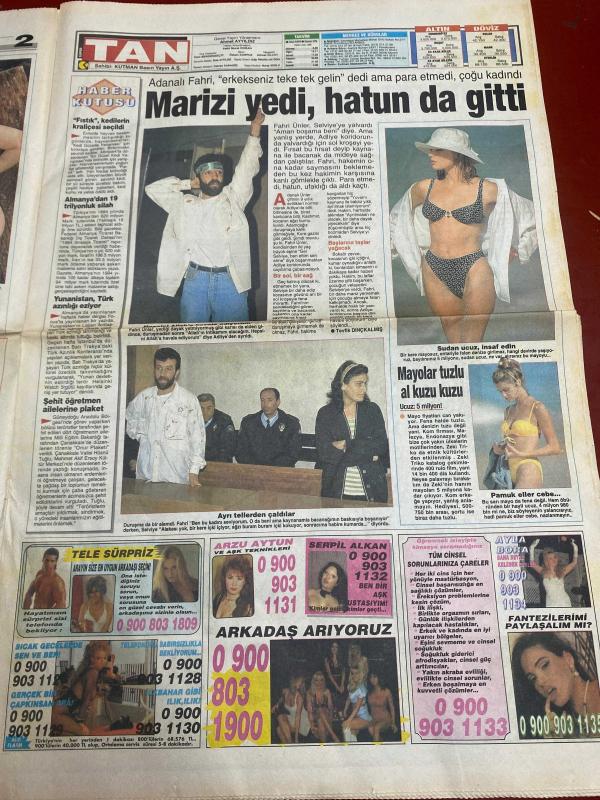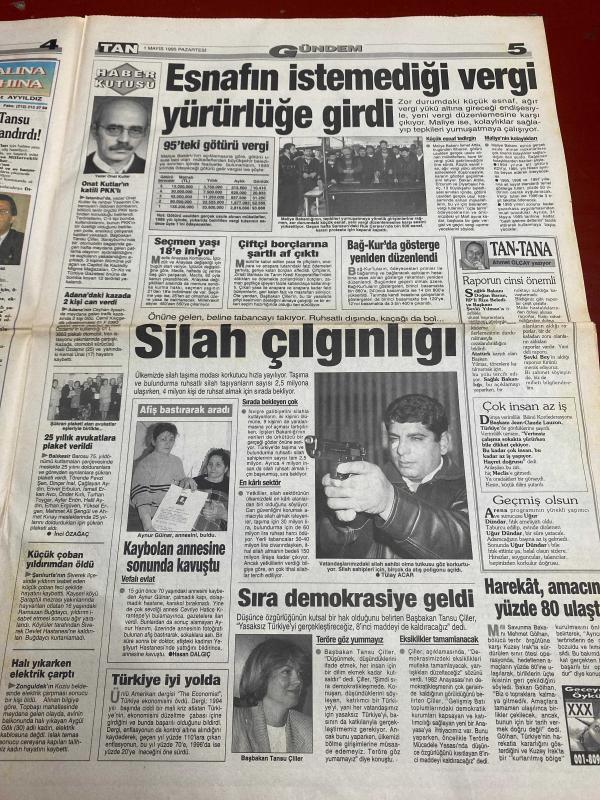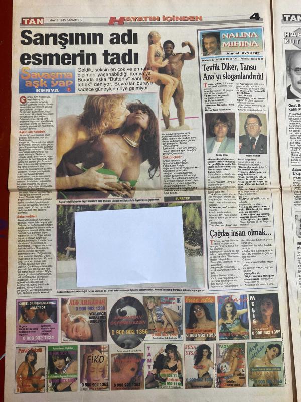 TAN GAZETESİ DOĞUM GÜNÜ HEDİYESİ - 1 MAYIS 1995 - TAM TAKIM 12 SAYFADIR -Ebru Şimşek-Ajda Pekkan-Emmoğlu-Aydın Güven Gürkan-Merve İldeniz-Serdar Ortaç-Fatih Ürek-Bülent Ersoy-Münir Özkul-Tülay Acar-Tansu Çiller-Ali Şen-İlhan Cavcav-Sergen Yalçın-Hakan Şükür-Kubilay Fahri-Tevfik Dinçkalmış-Onat Kutlar-Aynur Güler-Mehmet Barlas-Nurullah Ayan Süper TAN’la kimse yarışamaz-Millet kafayı yedi-Herkes bana bayılıyor-Aç kaldı soygun yaptı-Böbreğini satıyor-Tanju’nun şahidi fos umudu boş çıktı-Ajda yalama oldu-Hayat kadınına hayat sigortası-Helal olsun-Türk oh Yunan ah çekiyor-Memura mutluluk çubuğu-İsteyene tutturuyor-Dedikodu gecesi-Cavcav kıvırdı-Fazla konuşma-Hakan Kubilay’ı istiyor-Marizi yedi hatun da gitti-Esnafın istemediği vergi yürürlüğe girdi-Silah çılgınlığı-Sıra demokrasiye geldi Süper TAN Altılı Ganyan’da yine lider-Süper TAN’la takıl Altılı Ganyan’ı oyna köşe ol-Sahte baba yalancı bacı-Kirası arttı-Fellik fellik beyaz arandı-Çocuğunu öldürdü-İşsizlik enflasyon ve zamlar yüzünden s adlı eser, Kitap > Süreli Yayınlar > Gazeteler > Türkiye > Genel > Günlük kategorisinde İkinci El olarak satıştadır.