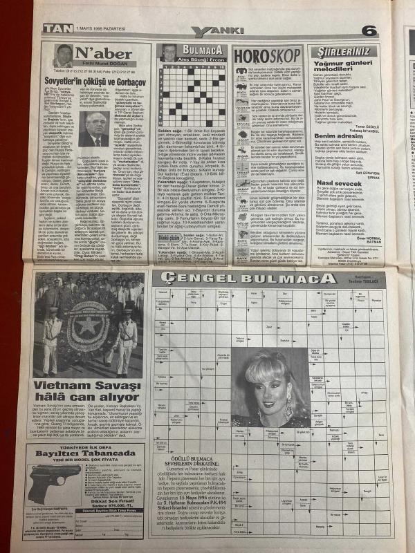TAN GAZETESİ DOĞUM GÜNÜ HEDİYESİ - 1 MAYIS 1995 - TAM TAKIM 12 SAYFADIR -Ebru Şimşek-Ajda Pekkan-Emmoğlu-Aydın Güven Gürkan-Merve İldeniz-Serdar Ortaç-Fatih Ürek-Bülent Ersoy-Münir Özkul-Tülay Acar-Tansu Çiller-Ali Şen-İlhan Cavcav-Sergen Yalçın-Hakan Şükür-Kubilay Fahri-Tevfik Dinçkalmış-Onat Kutlar-Aynur Güler-Mehmet Barlas-Nurullah Ayan Süper TAN’la kimse yarışamaz-Millet kafayı yedi-Herkes bana bayılıyor-Aç kaldı soygun yaptı-Böbreğini satıyor-Tanju’nun şahidi fos umudu boş çıktı-Ajda yalama oldu-Hayat kadınına hayat sigortası-Helal olsun-Türk oh Yunan ah çekiyor-Memura mutluluk çubuğu-İsteyene tutturuyor-Dedikodu gecesi-Cavcav kıvırdı-Fazla konuşma-Hakan Kubilay’ı istiyor-Marizi yedi hatun da gitti-Esnafın istemediği vergi yürürlüğe girdi-Silah çılgınlığı-Sıra demokrasiye geldi Süper TAN Altılı Ganyan’da yine lider-Süper TAN’la takıl Altılı Ganyan’ı oyna köşe ol-Sahte baba yalancı bacı-Kirası arttı-Fellik fellik beyaz arandı-Çocuğunu öldürdü-İşsizlik enflasyon ve zamlar yüzünden s, Kemal Gönül tarafından kaleme alınmıştır. Eser Rahmi Turan editörlüğünde hazırlanmıştır. Kitap Veb ofset tarafından yayınlanmıştır. 12 sayfadır. TAN GAZETESİ DOĞUM GÜNÜ HEDİYESİ - 1 MAYIS 1995 - TAM TAKIM 12 SAYFADIR -Ebru Şimşek-Ajda Pekkan-Emmoğlu-Aydın Güven Gürkan-Merve İldeniz-Serdar Ortaç-Fatih Ürek-Bülent Ersoy-Münir Özkul-Tülay Acar-Tansu Çiller-Ali Şen-İlhan Cavcav-Sergen Yalçın-Hakan Şükür-Kubilay Fahri-Tevfik Dinçkalmış-Onat Kutlar-Aynur Güler-Mehmet Barlas-Nurullah Ayan Süper TAN’la kimse yarışamaz-Millet kafayı yedi-Herkes bana bayılıyor-Aç kaldı soygun yaptı-Böbreğini satıyor-Tanju’nun şahidi fos umudu boş çıktı-Ajda yalama oldu-Hayat kadınına hayat sigortası-Helal olsun-Türk oh Yunan ah çekiyor-Memura mutluluk çubuğu-İsteyene tutturuyor-Dedikodu gecesi-Cavcav kıvırdı-Fazla konuşma-Hakan Kubilay’ı istiyor-Marizi yedi hatun da gitti-Esnafın istemediği vergi yürürlüğe girdi-Silah çılgınlığı-Sıra demokrasiye geldi Süper TAN Altılı Ganyan’da yine lider-Süper TAN’la takıl Altılı Ganyan’ı oyna köşe ol-Sahte baba yalancı bacı-Kirası arttı-Fellik fellik beyaz arandı-Çocuğunu öldürdü-İşsizlik enflasyon ve zamlar yüzünden s adlı eser Türkçe dilindedir.