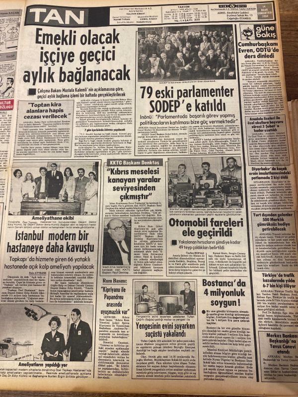 TAN GAZETESİ DOĞUM GÜNÜ HEDİYESİ - 14 OCAK 1984 - TAM TAKIM 8 SAYFADIR -Ayla-Adliye-Ayla Sayın-Karan Witter-Turgut Özal-Gülen Şengül-Cüneyt Arkın-Christine Haydar-Yalçın Gülhan-Joanna Key-Bora Paran-Osman Öndeş-Ekrem Bey-Sadettin Tantan-Hasan Bozbey-Yavuz Özmen-Rıdvan Demirkol-Ali Şen-Aydın Şükrü-Prof. Dr. Bülent Tarcan-Mustafa Kalemli-Mustafa Şerif Sarıibrahimoğlu-Mustafa Üstündağ-Rauf Denktaş-Rauf Raşit Kutlu-Adnan Kahveci-Tufan Çaklıoğlu-Paula Fahri-Hülya Kalyoncu “Madem erkek değildin benimle niye evlendin?”-Sapık yakalandı-Alev Sayın, her gün 51 erkeğin koynuna giriyor-Para yağmuru-Özal, Amerika’da verdiği kiloları Ankara’da aldı-Kadınlar dünyanın süsüdür-Mankenler kraliçesi seçildi-Sahibini yiyen kaplan idam edildi-Zeynep Sultan-“Hasan Bozbey’in gitmemekte direnmesi hayret vericidir”-Seçkiner, Bozbey’i görevden almaya hiç niyetim yok dedi-“Bizi taraftarlarımız yalnız bırakmasın yeter”-Yurdumuzdaki ev kazalarında her yıl ortalama 5 bin kişi ölüyor-“Mücevher sevmiyorum”-Emekli ola, Haldun Simavi tarafından kaleme alınmıştır. Eser Rahmi Turan editörlüğünde hazırlanmıştır. Kitap Veb ofset tarafından yayınlanmıştır. 8 sayfadır. TAN GAZETESİ DOĞUM GÜNÜ HEDİYESİ - 14 OCAK 1984 - TAM TAKIM 8 SAYFADIR -Ayla-Adliye-Ayla Sayın-Karan Witter-Turgut Özal-Gülen Şengül-Cüneyt Arkın-Christine Haydar-Yalçın Gülhan-Joanna Key-Bora Paran-Osman Öndeş-Ekrem Bey-Sadettin Tantan-Hasan Bozbey-Yavuz Özmen-Rıdvan Demirkol-Ali Şen-Aydın Şükrü-Prof. Dr. Bülent Tarcan-Mustafa Kalemli-Mustafa Şerif Sarıibrahimoğlu-Mustafa Üstündağ-Rauf Denktaş-Rauf Raşit Kutlu-Adnan Kahveci-Tufan Çaklıoğlu-Paula Fahri-Hülya Kalyoncu “Madem erkek değildin benimle niye evlendin?”-Sapık yakalandı-Alev Sayın, her gün 51 erkeğin koynuna giriyor-Para yağmuru-Özal, Amerika’da verdiği kiloları Ankara’da aldı-Kadınlar dünyanın süsüdür-Mankenler kraliçesi seçildi-Sahibini yiyen kaplan idam edildi-Zeynep Sultan-“Hasan Bozbey’in gitmemekte direnmesi hayret vericidir”-Seçkiner, Bozbey’i görevden almaya hiç niyetim yok dedi-“Bizi taraftarlarımız yalnız bırakmasın yeter”-Yurdumuzdaki ev kazalarında her yıl ortalama 5 bin kişi ölüyor-“Mücevher sevmiyorum”-Emekli ola adlı eser Türkçe dilindedir.