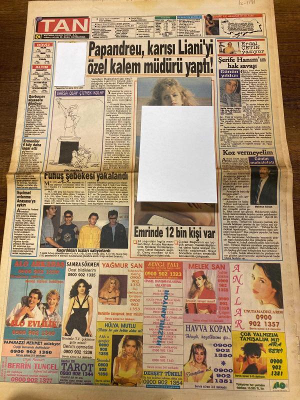 TAN GAZETESİ DOĞUM GÜNÜ HEDİYESİ - 15 EKİM 1993 - TAM TAKIM 8 SAYFADIR - Papandreu-Liani-Erdal Çetin-Şerife Hanım-Mahmut Alınak-Samras Sökmen-Yağmur San-Hülya Mutlu-Melek San-Havva Kopan-Anizar-Berrin Tuncel-Uğur-Ünal-Yüksel Akkan-Bill Cash-Gülben Ergen-Enis Ayyıldız-Danny Kaye-Marianna Fats-Teğmen Ali-Arzu-Melis Fırat-Güzin Abla-Haldun Sevel-Kenan Aydın-Aysu Tansu-Yose Mija Rioca-Yaşar Hoca-Papandreu karısı Liani’yi özel kalem müdürü yaptı-Fuhuş şebekesi yakalandı-Emrinde 12 bin kişi var-Lig alt üst olacak-Cim Bom’un nefesi Kocaeli’nin ensesinde-Kartal Ajax niyetine-Olmak ya da olmamak-Yaşam süresini uzatmak insanın kendi elindedir-Sevgilisini sekreterim diyerek Meclis’e soktu-Aşka bak aşk-Teğmen Ali kovuldu-Temizlik merakı Arzu’ya çok pahalıya mal oldu-Melis’e süper hediye-Her mutfağa el mikseri-Özel korumalar kuş uçurtmuyor-Ustura Kemal Ya İstiklal Ya İstiklal-Haldun Sevel, Kemal Gönül tarafından kaleme alınmıştır. Eser Rahmi Turan editörlüğünde hazırlanmıştır. Kitap Veb ofset tarafından yayınlanmıştır. 8 sayfadır. TAN GAZETESİ DOĞUM GÜNÜ HEDİYESİ - 15 EKİM 1993 - TAM TAKIM 8 SAYFADIR - Papandreu-Liani-Erdal Çetin-Şerife Hanım-Mahmut Alınak-Samras Sökmen-Yağmur San-Hülya Mutlu-Melek San-Havva Kopan-Anizar-Berrin Tuncel-Uğur-Ünal-Yüksel Akkan-Bill Cash-Gülben Ergen-Enis Ayyıldız-Danny Kaye-Marianna Fats-Teğmen Ali-Arzu-Melis Fırat-Güzin Abla-Haldun Sevel-Kenan Aydın-Aysu Tansu-Yose Mija Rioca-Yaşar Hoca-Papandreu karısı Liani’yi özel kalem müdürü yaptı-Fuhuş şebekesi yakalandı-Emrinde 12 bin kişi var-Lig alt üst olacak-Cim Bom’un nefesi Kocaeli’nin ensesinde-Kartal Ajax niyetine-Olmak ya da olmamak-Yaşam süresini uzatmak insanın kendi elindedir-Sevgilisini sekreterim diyerek Meclis’e soktu-Aşka bak aşk-Teğmen Ali kovuldu-Temizlik merakı Arzu’ya çok pahalıya mal oldu-Melis’e süper hediye-Her mutfağa el mikseri-Özel korumalar kuş uçurtmuyor-Ustura Kemal Ya İstiklal Ya İstiklal-Haldun Sevel adlı eser Türkçe dilindedir.
