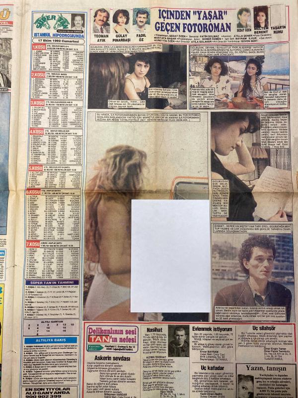 TAN GAZETESİ DOĞUM GÜNÜ HEDİYESİ - 17 EKİM 1992 -SADECE 4 SAYFADIR -Melahat Hanım-Sevim Egesoy-Okyay-Oya-Oymak-Cumhuriyet Savcısı-Hayri Özdemir-Turgut Özal-Ahmet-Neslişah-Aziz Bey-Yılmaz Topaloğlu-Berrin Tunçel-Yalçın Menteş-Y.Y.-Haldun Sevel-Teoman Ayık-Gülay Pınarbaşı-Fadıl Öz-Sedat Özen-Melet Ay-Yaşar Fatih Solmaz-Nurtaç Azap-Atıla Selçuk-Şafak Bayar-Lütfi Karan Adam öldürmenin cezası bu kadar mı-Çapkınlara gün doğdu-Onun işini kömürlükte bitirdim-İçinden Yaşar geçen fotoroman-Neslişah Kıbrıs’ın tamamını fethetti-Üsküdar Televizyonu Mor Noktalı yayına başlıyor Ustura Kemal-Haldun Sevel, Haldun Simavi tarafından kaleme alınmıştır. Eser Rahmi Turan editörlüğünde hazırlanmıştır. Kitap Veb ofset tarafından yayınlanmıştır. 4 sayfadır. TAN GAZETESİ DOĞUM GÜNÜ HEDİYESİ - 17 EKİM 1992 -SADECE 4 SAYFADIR -Melahat Hanım-Sevim Egesoy-Okyay-Oya-Oymak-Cumhuriyet Savcısı-Hayri Özdemir-Turgut Özal-Ahmet-Neslişah-Aziz Bey-Yılmaz Topaloğlu-Berrin Tunçel-Yalçın Menteş-Y.Y.-Haldun Sevel-Teoman Ayık-Gülay Pınarbaşı-Fadıl Öz-Sedat Özen-Melet Ay-Yaşar Fatih Solmaz-Nurtaç Azap-Atıla Selçuk-Şafak Bayar-Lütfi Karan Adam öldürmenin cezası bu kadar mı-Çapkınlara gün doğdu-Onun işini kömürlükte bitirdim-İçinden Yaşar geçen fotoroman-Neslişah Kıbrıs’ın tamamını fethetti-Üsküdar Televizyonu Mor Noktalı yayına başlıyor Ustura Kemal-Haldun Sevel adlı eser Türkçe dilindedir.