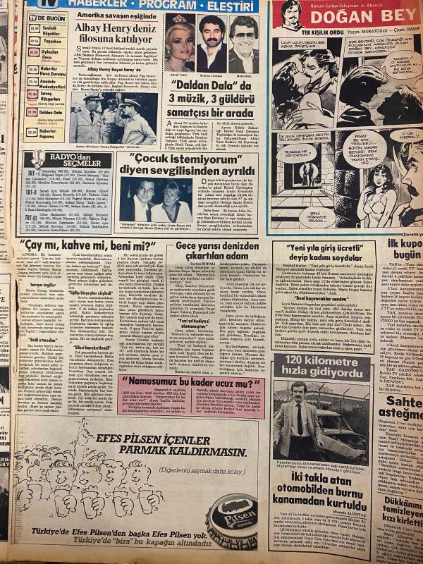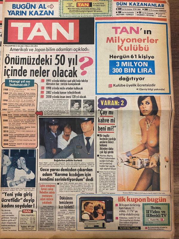 TAN GAZETESİ DOĞUM GÜNÜ HEDİYESİ - 2 OCAK 1984 - TAM TAKIM 8 SAYFADIR -Bülent Aksu-Başar Eser-Marta-Hans Gisela-Bayan Christine-Gülay Eryüce-Osman Öndeş-Fulya-Necdet Kayador-Onur-Asuman Kayador-Fatih Kayador-Nadia Comaneci-Necat Eldem-Hüseyin Küçükoğlu-Lütfiye Ayşe Emre-Kadri Kenerep-Mevher Hanım-Cheery Maskell-Audrey Landers-Franco Andrei Önümüzdeki 50 yıl içinde neler olacak-Gece yarısı denizden çıkarılan adam karıma kızdığım için kendimi serinletiyordum dedi-Dükkanını temizleyen kızı kirletti-Namusumuz bu kadar ucuz mu-Artık erkeklere masaj yapmıyor-Doktorların bir aylık ömrü var dedikleri çocuk 10 yıl yaşıyor-Erkekler kadınların kadınlar da erkeklerin kalçasına bakıyor-Zeynep Sultan-Ümit dolu bir yıl-Kaptanlar yeni yıla nasıl girdi-Sema’nın hocası aynı zamanda kocası-Fransa’daki bombalı saldırılar Çakal örgütü üstlendi-1984’ün ilk olayları-100 milyonluk kaçakçılık-Dünyada yeni yıla patlayan bombalar arasında girildi-Köpek hanımına bayıldı-67’lik damat çocuk yapmıyor diye 2 aylık k adlı eser, Kitap > Süreli Yayınlar > Gazeteler > Türkiye > Genel > Günlük kategorisinde İkinci El olarak satıştadır.