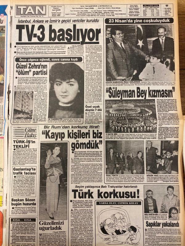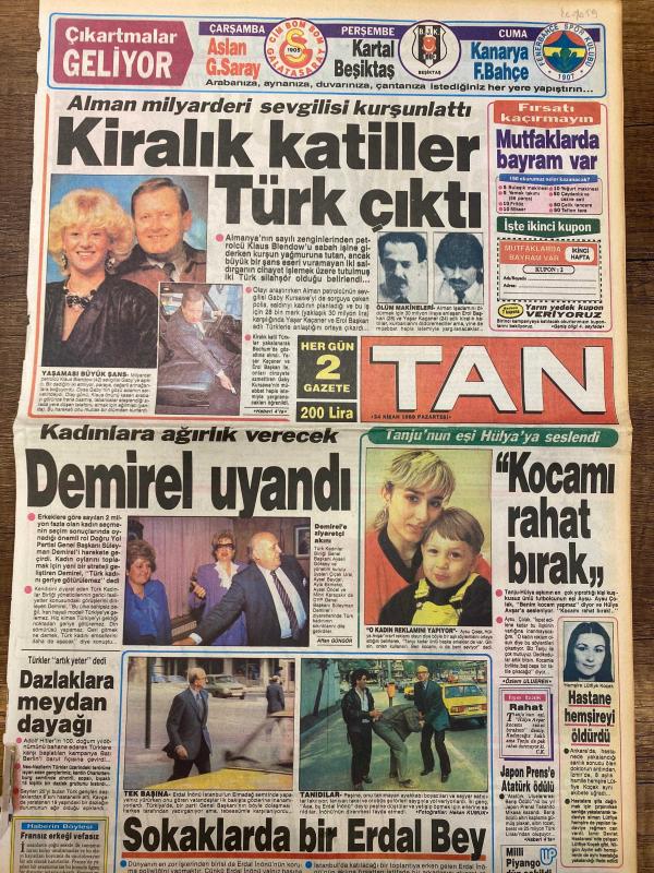 TAN GAZETESİ DOĞUM GÜNÜ HEDİYESİ - 24 NİSAN 1989 - TAM TAKIM 8 SAYFADIR -Klaus Blendow-Süleyman Demirel-Ayla Önal-Tanju Çolak-Hülya Koçyiğit-Afşin Güngör-Leman Küçük-Halil Erdal İnönü-Turgay Renkli Kurt-Özer Kanra-Demir Fevzioğlu-Veselinoviç-Milne-Ahmet Altun-Murat Roman-Ercüment Goy-Tolga Orno-Meslin Özkan-Turgut Özal-Mesut Yılmaz-Yavuz Zengin-Lefter Küçükandonyadis-Zeki Müren-Müslüm Gürses -Kiralık Katiller Türk Çıktı-Demirel Uyandı-Kocamı Rahat Bırak-Sokaklarda Bir Erdal Bey-Fener Arayı Açıyor-Beşiktaş Yaralı-Zeytinburnu Şampiyon-Et Balık Fakiri Vurdu-TV-3 Başlıyor-Güzel Zehra’nın Ölüm Partisi-Kayıp Kişileri Biz Gömdük-Türk Korkusu-Son Saniye Golü İle Şampiyonluk-Ayrıldık İşte-Vefasız Alem adlı eser, Kitap > Süreli Yayınlar > Gazeteler > Türkiye > Genel > Günlük kategorisinde İkinci El olarak satıştadır.