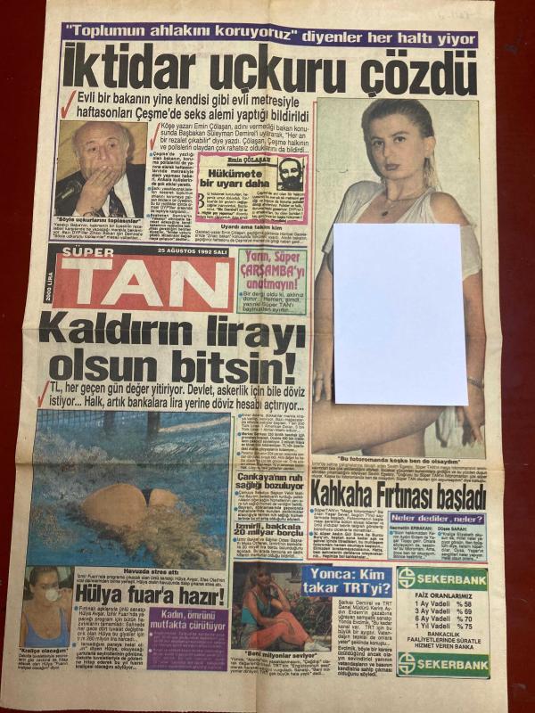 TAN GAZETESİ DOĞUM GÜNÜ HEDİYESİ - 25 AĞUSTOS 1992 - 4 SAYFADIR -Emin Çölaşan-Süleyman Demirel-Hülya Avşar-Efes Otel-Yonca Evcimik-Haldun Sevel-Ercan Sunay-Teoman Ayık-Gülay Pınarbaşı-Fadıl Öz-Gül Ebre-Burcu Burç-Nur İlhan-Nuri Karan-Asuhan-Nurettin Sözen-Lütfiye Karan-Mustafa Gökgöz-Ahmet Aydın-Mehmet Baran İktidar uckuru çözdü-Kaldırın lirayı olsun bitsin-Hülya fuara hazır-Kadın ömrünü mutfakta çürütüyor-Kahkaha fırtınası başladı-Yonca kim takar TRT’yi-Banyoyu birlikte yaptık-Bazıları Yaşar sever-Oto hırsızı otomobili nasıl çalar-Nurettin’in renk zevkine hayranım-Asuhan yazlık mayolarını belediyecilere seçtirmiş-Kedi ham dedi yuttu-Minik farenin sonu Toplumun ahlakını koruyoruz diyenler her haltı yiyor-Hükümete bir uyarı daha-Yarın süper çarşambayı kaçırmayın-Çankaya’nın ruh sağlığı bozuluyor-İzmirli bakkala 20 milyar borçlu-Bu fotomodelin keşke ben de olsaydım demişti-Kraliçe olacağım dedi-Beni milyonlar seviyor-Ölümün sıcak yüzü-Ustura Kemal-Yalnız asker-Merhaba kızlar-Yaşamayı sev adlı eser, Kitap > Süreli Yayınlar > Gazeteler > Türkiye > Genel > Günlük kategorisinde İkinci El olarak satıştadır.