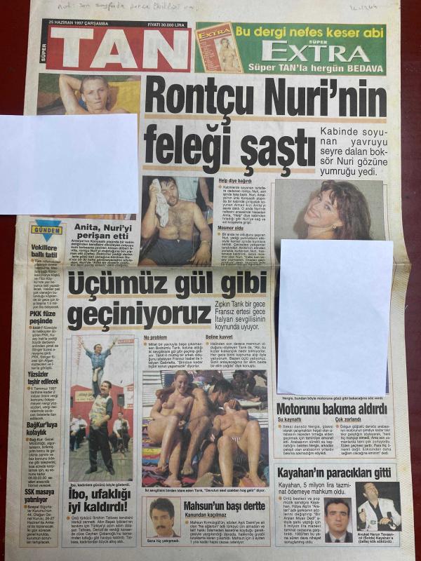 TAN GAZETESİ DOĞUM GÜNÜ HEDİYESİ - 25 HAZİRAN 1997 - TAM TAKIM 8 SAYFADIR -Nuri-Anita-Tarık-Mahsun Kırmızıgül-Kayahan-Harun Tavaşoğlu-Fatih Terim-Mehmet Alatlıoğlu-Arzum Onan-Coşkun Sabah-Ceyda Okay-Rafet El Roman-İlker Demir-Cornelia Schorr-Gökhan Şükür-Teslime Tablacı-Murat Ersoy-Mehmet Otruğ-Sibel Can-Seda Öz-Tuğba Başer-Mehmet Duru-Mehmet Ertan-Toprak ailesi-Haluk Müftüler-Bahattin Atak Rontçu Nuri’nin feleği şaştı-Üçümüz gül gibi geçiniyoruz-Motorunu bakıma aldırdı-Kayahan’ın paracıkları gitti-Mahsun’un başı dertte-Sanki erkek kıtlığı var-Lezzolar işin cıvısını çıkardı-41’lik Coşkun 20’lik kızla gerdeğe girdi-Almanya’ya damat verdik-Rafet dokuz doğuruyor-İkizleri terasa çıkardı-Fatih Terim sinir küpü-Dayak yiyen gencin korkunç intikamı-Kriz geçirdi faciayı önledi-Küçük Ali’yi güneş çarptı-Yazın tadını çıkarıyor-Seksten önce dekoru hazırlayın-Çırpınıyordu ama razıydı-Baştan çıkarıcı olun İbo ufaklığı iyi kaldırdı-Anita Nuri’yi perişan etti-Bağkur’luya kolaylık-SSK masaya yatırılı, Kemal Gönül tarafından kaleme alınmıştır. Eser Rahmi Turan editörlüğünde hazırlanmıştır. Kitap Veb ofset tarafından yayınlanmıştır. 8 sayfadır. TAN GAZETESİ DOĞUM GÜNÜ HEDİYESİ - 25 HAZİRAN 1997 - TAM TAKIM 8 SAYFADIR -Nuri-Anita-Tarık-Mahsun Kırmızıgül-Kayahan-Harun Tavaşoğlu-Fatih Terim-Mehmet Alatlıoğlu-Arzum Onan-Coşkun Sabah-Ceyda Okay-Rafet El Roman-İlker Demir-Cornelia Schorr-Gökhan Şükür-Teslime Tablacı-Murat Ersoy-Mehmet Otruğ-Sibel Can-Seda Öz-Tuğba Başer-Mehmet Duru-Mehmet Ertan-Toprak ailesi-Haluk Müftüler-Bahattin Atak Rontçu Nuri’nin feleği şaştı-Üçümüz gül gibi geçiniyoruz-Motorunu bakıma aldırdı-Kayahan’ın paracıkları gitti-Mahsun’un başı dertte-Sanki erkek kıtlığı var-Lezzolar işin cıvısını çıkardı-41’lik Coşkun 20’lik kızla gerdeğe girdi-Almanya’ya damat verdik-Rafet dokuz doğuruyor-İkizleri terasa çıkardı-Fatih Terim sinir küpü-Dayak yiyen gencin korkunç intikamı-Kriz geçirdi faciayı önledi-Küçük Ali’yi güneş çarptı-Yazın tadını çıkarıyor-Seksten önce dekoru hazırlayın-Çırpınıyordu ama razıydı-Baştan çıkarıcı olun İbo ufaklığı iyi kaldırdı-Anita Nuri’yi perişan etti-Bağkur’luya kolaylık-SSK masaya yatırılı adlı eser Türkçe dilindedir.