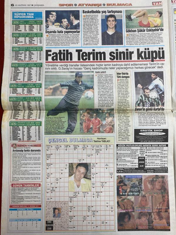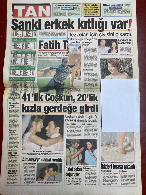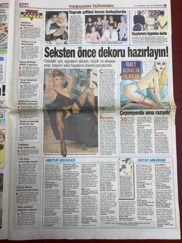 TAN GAZETESİ DOĞUM GÜNÜ HEDİYESİ - 25 HAZİRAN 1997 - TAM TAKIM 8 SAYFADIR -Nuri-Anita-Tarık-Mahsun Kırmızıgül-Kayahan-Harun Tavaşoğlu-Fatih Terim-Mehmet Alatlıoğlu-Arzum Onan-Coşkun Sabah-Ceyda Okay-Rafet El Roman-İlker Demir-Cornelia Schorr-Gökhan Şükür-Teslime Tablacı-Murat Ersoy-Mehmet Otruğ-Sibel Can-Seda Öz-Tuğba Başer-Mehmet Duru-Mehmet Ertan-Toprak ailesi-Haluk Müftüler-Bahattin Atak Rontçu Nuri’nin feleği şaştı-Üçümüz gül gibi geçiniyoruz-Motorunu bakıma aldırdı-Kayahan’ın paracıkları gitti-Mahsun’un başı dertte-Sanki erkek kıtlığı var-Lezzolar işin cıvısını çıkardı-41’lik Coşkun 20’lik kızla gerdeğe girdi-Almanya’ya damat verdik-Rafet dokuz doğuruyor-İkizleri terasa çıkardı-Fatih Terim sinir küpü-Dayak yiyen gencin korkunç intikamı-Kriz geçirdi faciayı önledi-Küçük Ali’yi güneş çarptı-Yazın tadını çıkarıyor-Seksten önce dekoru hazırlayın-Çırpınıyordu ama razıydı-Baştan çıkarıcı olun İbo ufaklığı iyi kaldırdı-Anita Nuri’yi perişan etti-Bağkur’luya kolaylık-SSK masaya yatırılı adlı eser, Kitap > Süreli Yayınlar > Gazeteler > Türkiye > Genel > Günlük kategorisinde İkinci El olarak satıştadır.