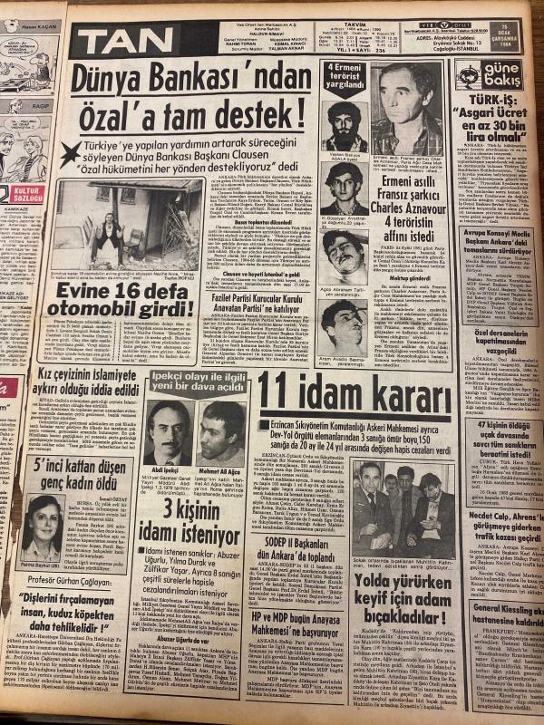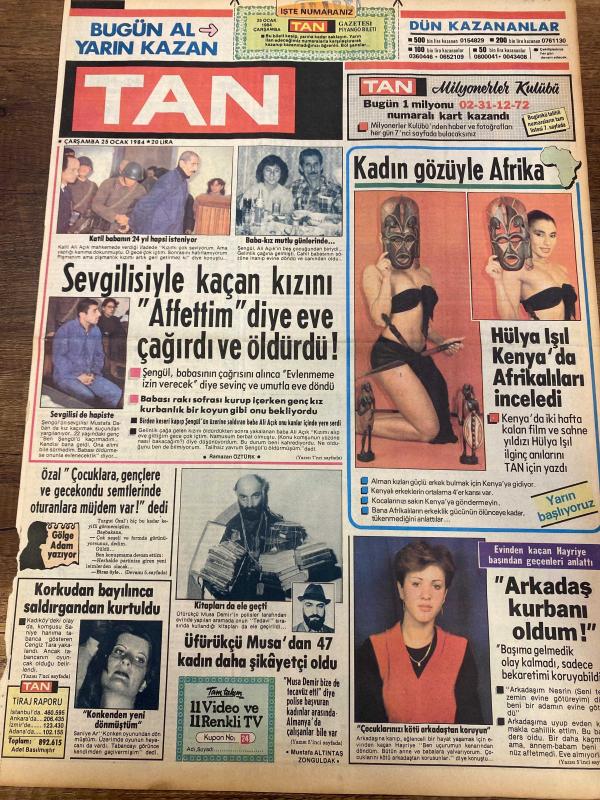 TAN GAZETESİ DOĞUM GÜNÜ HEDİYESİ - 25 OCAK 1984 - TAM TAKIM 8 SAYFADIR -Şengül-Özal-Gölge Adam-Ramazan Öztürk-Hülya Işıl-Musa-Demir Mustafa Altıntaş-Mustafa Altıntaş-Hayriye-Nihal Hoş-Metin Feyizoğlu-Fikret-Miliç-Seydiç-G.Saray A Takımı-Ömer-İlyas-Simtel-Metin Önal-Charles Aznavour-Vaskin Beliyan-K. Guezyan Avadis-Arşag Agop Abraham-Fatma Baykut-Abdi İpekçi-Mehmet Ali Ağca-Abuzer Uğurlu-Yılmaz Durak-Zülfikar Yüce-Necdet Calp-Antonella Interlenghi-Nahit Mustafa Kossali-Pamela Ülker-Rüçhan Adlı-Lale-Egemen Gündoğan Şen-Osman Hancz Sevgilisiyle kaçan kızını “Affettim” diye eve çağırdı ve öldürdü-Kadın gözüyle Afrika-Üfürükçü Musa’dan 47 kadın daha şikayetçi oldu-Arkadaş kurbanı oldum-Özal “Çocuklara, gençlere ve gecekondu semtlerinde oturanlara müjdem var” dedi-Korkudan bayılınca saldırgandan kurtuldu-Konken’den yeni dönüşüm-Dünya Bankası’ndan Özal’a tam destek-Evine 16 defa otomobil girdi-4 Ermeni terörist yargılandı-Charles Aznavour 4 teröristin affını istedi-11 idam kararı-Yolda yürürk adlı eser, Kitap > Süreli Yayınlar > Gazeteler > Türkiye > Genel > Günlük kategorisinde İkinci El olarak satıştadır.