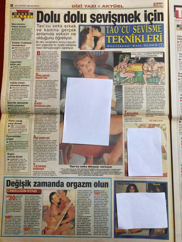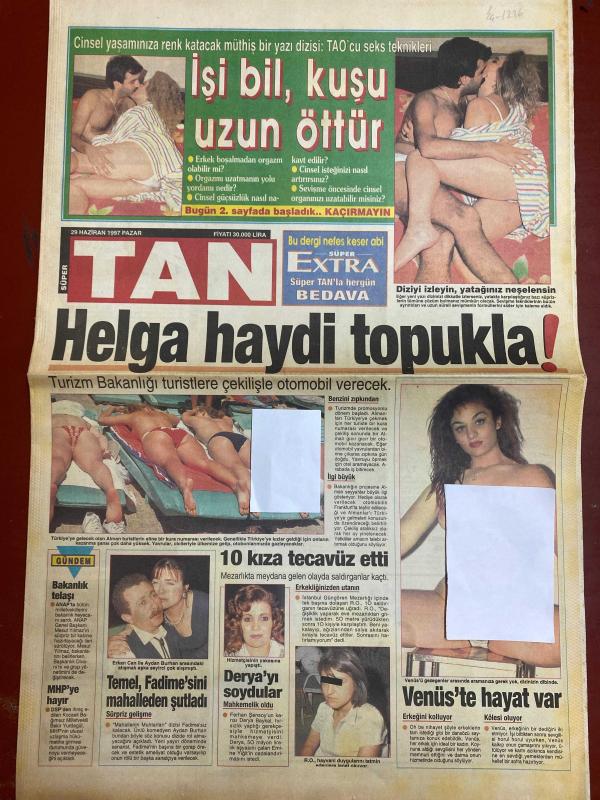 TAN GAZETESİ DOĞUM GÜNÜ HEDİYESİ - 29 HAZİRAN 1997 - TAM TAKIM 8 SAYFADIR -Helga-Temel-Fadime-Derya-Hülya Avşar-Faruk Peter-Ayşegül K.Çiçekçi-Neriman-Toshack-Terim-Hasan Türköz-Sabri Yeşileyen-Hanıme Nuri-Ali Kalkancı-Mehmet Ali Birand-Savaş Yıldız-Teslime Tablacı-Esin Ulubaş-Gönül İşi bil kuşu uzun öttür-Helga haydi topukla-10 kıza tecavüz etti-Derya’yı soydular-Venüs’te hayat var-Aşk hamamı basıldı-Ne şanslı velet-Sevgilisini çıldırttı-Çapkın kurt işbaşında-Marsık gibi oldu-Gazi Koşusu’nu kazanan 25 milyar lirayı götürecek-En fazla kazanan eküri Elieyşil olacak-Gazide büyük heyecan-Eniştesini satırla doğradı-PKK haraççıları yakalandı-Transparan yine gözde-Erkekler yatakta patron mu?-Hizmetçinin tuzağına düştüm-Dolu dolu sevişmek için-Değişik zamanda orgazm olun TAO’cu seks teknikleri-TAO’cu sevişme teknikleri-Cinsel yaşamınıza renk katacak müthiş bir yazı dizisi-Alemcilerin hamam sefası kursaklarında kaldı-Hülya bak tekmeliyor-Sırnaşık-Bravo olay karı-70 yaşından sonra ablasını boşa, Kemal Gönül tarafından kaleme alınmıştır. Eser Rahmi Turan editörlüğünde hazırlanmıştır. Kitap Veb ofset tarafından yayınlanmıştır. 8 sayfadır. TAN GAZETESİ DOĞUM GÜNÜ HEDİYESİ - 29 HAZİRAN 1997 - TAM TAKIM 8 SAYFADIR -Helga-Temel-Fadime-Derya-Hülya Avşar-Faruk Peter-Ayşegül K.Çiçekçi-Neriman-Toshack-Terim-Hasan Türköz-Sabri Yeşileyen-Hanıme Nuri-Ali Kalkancı-Mehmet Ali Birand-Savaş Yıldız-Teslime Tablacı-Esin Ulubaş-Gönül İşi bil kuşu uzun öttür-Helga haydi topukla-10 kıza tecavüz etti-Derya’yı soydular-Venüs’te hayat var-Aşk hamamı basıldı-Ne şanslı velet-Sevgilisini çıldırttı-Çapkın kurt işbaşında-Marsık gibi oldu-Gazi Koşusu’nu kazanan 25 milyar lirayı götürecek-En fazla kazanan eküri Elieyşil olacak-Gazide büyük heyecan-Eniştesini satırla doğradı-PKK haraççıları yakalandı-Transparan yine gözde-Erkekler yatakta patron mu?-Hizmetçinin tuzağına düştüm-Dolu dolu sevişmek için-Değişik zamanda orgazm olun TAO’cu seks teknikleri-TAO’cu sevişme teknikleri-Cinsel yaşamınıza renk katacak müthiş bir yazı dizisi-Alemcilerin hamam sefası kursaklarında kaldı-Hülya bak tekmeliyor-Sırnaşık-Bravo olay karı-70 yaşından sonra ablasını boşa adlı eser Türkçe dilindedir.