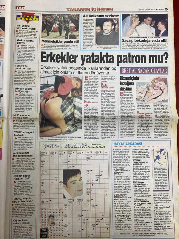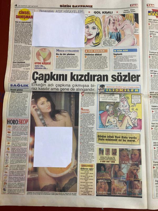 TAN GAZETESİ DOĞUM GÜNÜ HEDİYESİ - 29 HAZİRAN 1997 - TAM TAKIM 8 SAYFADIR -Helga-Temel-Fadime-Derya-Hülya Avşar-Faruk Peter-Ayşegül K.Çiçekçi-Neriman-Toshack-Terim-Hasan Türköz-Sabri Yeşileyen-Hanıme Nuri-Ali Kalkancı-Mehmet Ali Birand-Savaş Yıldız-Teslime Tablacı-Esin Ulubaş-Gönül İşi bil kuşu uzun öttür-Helga haydi topukla-10 kıza tecavüz etti-Derya’yı soydular-Venüs’te hayat var-Aşk hamamı basıldı-Ne şanslı velet-Sevgilisini çıldırttı-Çapkın kurt işbaşında-Marsık gibi oldu-Gazi Koşusu’nu kazanan 25 milyar lirayı götürecek-En fazla kazanan eküri Elieyşil olacak-Gazide büyük heyecan-Eniştesini satırla doğradı-PKK haraççıları yakalandı-Transparan yine gözde-Erkekler yatakta patron mu?-Hizmetçinin tuzağına düştüm-Dolu dolu sevişmek için-Değişik zamanda orgazm olun TAO’cu seks teknikleri-TAO’cu sevişme teknikleri-Cinsel yaşamınıza renk katacak müthiş bir yazı dizisi-Alemcilerin hamam sefası kursaklarında kaldı-Hülya bak tekmeliyor-Sırnaşık-Bravo olay karı-70 yaşından sonra ablasını boşa adlı eser, Kitap > Süreli Yayınlar > Gazeteler > Türkiye > Genel > Günlük kategorisinde İkinci El olarak satıştadır.