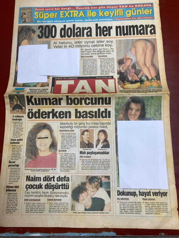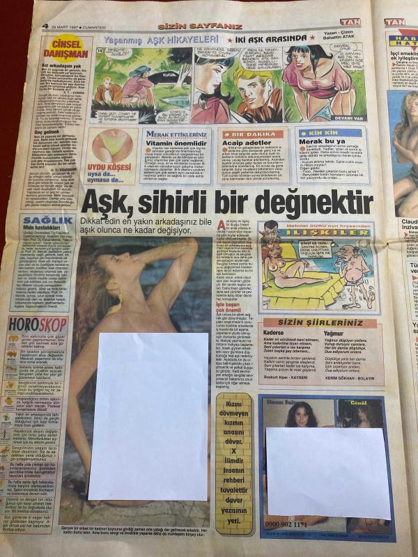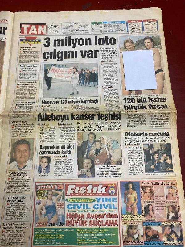 TAN GAZETESİ DOĞUM GÜNÜ HEDİYESİ - 29 MART 1997 - TAM TAKIM 8 SAYFADIR -Naim Süleymanoğlu-Mulalı-Mustafa Ada-Nazmiye Kurt-Arap Celal-Bülent Ersoy-Deniz Pulaş-Karhan Çantay-Gül İğdemir-Ebru Gündeş-Münevver-Yaşar Filizoğlu-Gülen Filizoğlu-Sümi Ketel-Kenan İmirzalıoğlu-Claudia Schiffer-Ahmet Özal-Teslime Tablacı-Sergen Yalçın-Rıdvan Dilmen-Osman Arpacıoğlu-Tugay Kerimoğlu-Oğuz Çetin-Seda Öz-Tuğba Bayer-İnci Aral-Nergis-Yılmaz Morgül-Hülya Avşar-Naim dört defa çocuk düşürttü-Kumar borcunu öderken basıldı-Malı paylaşamadılar-Dokunup hayat veriyor-300 dolara her numara-Arap Celal fırça sezonunu açtı-Resepsiyon memuru müşterisini sattı-Hangisi aptal?-Aylin erkekleri günaha çağırıyor-Ebru zirveye oturdu-3 milyon loto çılgını var-Aileboyu kanser teşhisi-Kaymakamın aklı canavarda kaldı-Otobüste curcuna-Mandalla orgazm oluyorlar-Kenan’ın yeni aşkı-Sevgilisi onurunu kırınca ölmek istedi-Namus cinayeti-Yönetimin kölesi değilim-Yunanlılar kendine gelemedi-Yunanistan gazeteleri ne yazdı?-Mis gibi mis adlı eser, Kitap > Süreli Yayınlar > Gazeteler > Türkiye > Genel > Günlük kategorisinde İkinci El olarak satıştadır.