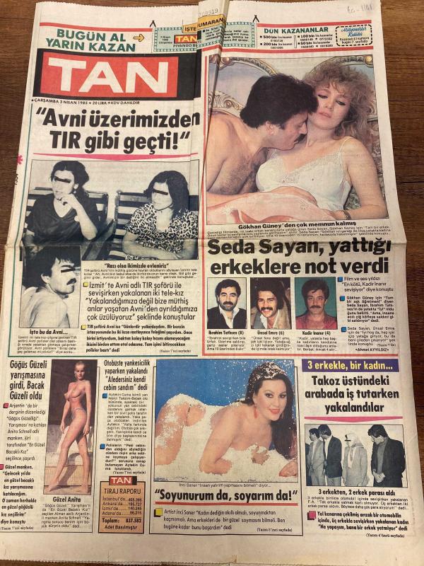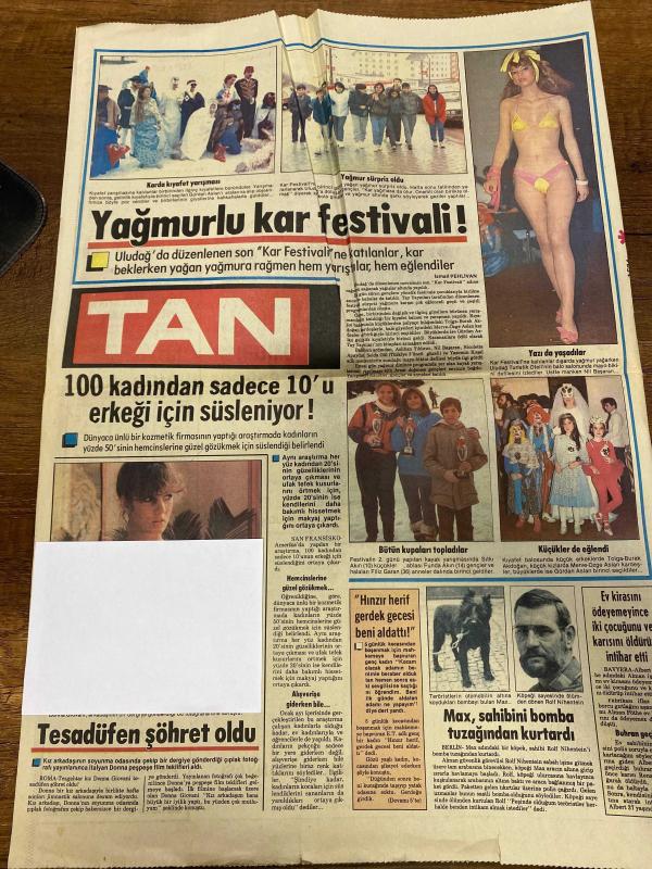 TAN GAZETESİ DOĞUM GÜNÜ HEDİYESİ - 3 NİSAN 1985 - 4 SAYFADIR -Avni-Gökhan Güney-Seda Sayan-İbrahim Tatlıses-Ünsal Emre-Kadir İnanır-Anita Schell-Inci Saner-Hanço Kazım-Hüsnü Kaçan-Metin-Tuncer-Güzin Abla-Kumru Hincal-Daniel-Pamela-Halil Ayhan-Burhan Ay-Gönül Aslan-Donnna-Paola Nitti-Nilüfer-Nil Biçer-Nihat Filiz-Gazan Alp Görücü-Nilüfer Nil Biçer-Max-Manfred Nüthling-Avni üzerimizden TIR gibi geçti-Seda Sayan yattığı erkeklere not verdi-Göğüs Güzeli yarışmasına girdi Bacak Güzeli oldu-Soyunurum da soyarım da-Evlilik fedakarlık ister-Sevdiğinizden haber var-Yolun Sonunda-Yağmurlu kar festivali-100 kadından sadece 10’u erkeği için süsleniyor-Tesadüfen şöhret oldu-Hınzır herif gerdek gecesi beni aldattı-Max sahibini bomba tuzağından kurtardı-Obüsle yankesicilik yaparken yakalandı-Affedersiniz kendi cebim sandım dedi-İş Bankası’nın güven göstergeleri-Evlilikte sadakat çok önemli-Evliliğe önem veriyorsanız sevginizi ihmal etmeyin-Güzellik yarışmasında birinci oldu-Karda kıyafet yarışması-Ya, Haldun Simavi tarafından kaleme alınmıştır. Eser Rahmi Turan editörlüğünde hazırlanmıştır. Kitap Veb ofset tarafından yayınlanmıştır. 4 sayfadır. TAN GAZETESİ DOĞUM GÜNÜ HEDİYESİ - 3 NİSAN 1985 - 4 SAYFADIR -Avni-Gökhan Güney-Seda Sayan-İbrahim Tatlıses-Ünsal Emre-Kadir İnanır-Anita Schell-Inci Saner-Hanço Kazım-Hüsnü Kaçan-Metin-Tuncer-Güzin Abla-Kumru Hincal-Daniel-Pamela-Halil Ayhan-Burhan Ay-Gönül Aslan-Donnna-Paola Nitti-Nilüfer-Nil Biçer-Nihat Filiz-Gazan Alp Görücü-Nilüfer Nil Biçer-Max-Manfred Nüthling-Avni üzerimizden TIR gibi geçti-Seda Sayan yattığı erkeklere not verdi-Göğüs Güzeli yarışmasına girdi Bacak Güzeli oldu-Soyunurum da soyarım da-Evlilik fedakarlık ister-Sevdiğinizden haber var-Yolun Sonunda-Yağmurlu kar festivali-100 kadından sadece 10’u erkeği için süsleniyor-Tesadüfen şöhret oldu-Hınzır herif gerdek gecesi beni aldattı-Max sahibini bomba tuzağından kurtardı-Obüsle yankesicilik yaparken yakalandı-Affedersiniz kendi cebim sandım dedi-İş Bankası’nın güven göstergeleri-Evlilikte sadakat çok önemli-Evliliğe önem veriyorsanız sevginizi ihmal etmeyin-Güzellik yarışmasında birinci oldu-Karda kıyafet yarışması-Ya adlı eser Türkçe dilindedir.