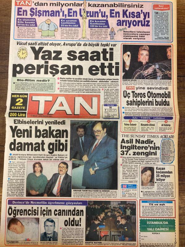 TAN GAZETESİ DOĞUM GÜNÜ HEDİYESİ - 3 NİSAN 1989 - TAM TAKIM 8 SAYFADIR -Halil Şıvgın-Asil Nadir-Fatma Özdemir-Ali Kütürüp-Necmettin Öğretmen-Oğuz Çetin-Metin Tekin-Müjdat Yetkiner-Metin Görgen-Oğuz Gökçe-Müjdat Yetkiner-Rıdvan Dilmen-Schumacher-Sezen Aksu-Yüksel Uzel-Hüseyin Altın-Mustafa Güneş-Gülden-Gürsel-Zerrin Kadir-Valerie Aikido-Halil Usta-Nasoto-Benazir Butto-Yaser Arafat-Rauf Denktaş-Deniz-Yunanistan Başbakanı Andreas Papandreu-Turgut Özal-Osman Balıkçı-Bora Baran -Yaz Saati Perişan Etti-Yeni Bakan Damat Gibi-Üç Toros Otomobil Sahiplerini Buldu-Öğrencisi İçin Canından Oldu-Beşiktaş İpten Döndü:2-1-F.Bahçe 2 Attı Keyfine Baktı-Kartal Son Anda Dirildi-Z.Burnu’na Bu Yakışır:3-0-Bakırköy Başkentten 3 Puan Kaptı-Çıplak Zenginler-Şöhrete Kavuştu Ama Mirasıtan Oldu-Çirkin Saldırı-Zor Nisan-Biz Gafil Avlanmayız-İktidarı Vermeyiz adlı eser, Kitap > Süreli Yayınlar > Gazeteler > Türkiye > Genel > Günlük kategorisinde İkinci El olarak satıştadır.