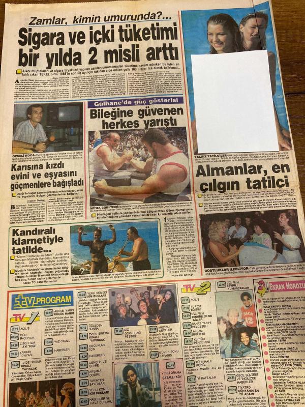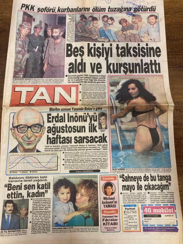 TAN GAZETESİ DOĞUM GÜNÜ HEDİYESİ - 31 TEMMUZ 1989 - 4 SAYFADIR -Yasemin Belen-Erdal İnönü-Yavuz Demirel-Ayhan Duman-Alman Sabrina-Rumen Moça-Gönül Yazar-Hüseyin Emre-İbrahim Tatlı-Kıvanç Tali-Ahmet Akbulut-Şadi Günör-Nakiya Tanrıkulu-Öfkeli Koca-Mustafa Kandıralı-Aladddin Savaş-Vedat Kaptan-Neris-Nefis-Alpay-Hilmi Bey-Aylincik-Kyle-Alex-Değer Ercüment Bulut-PKK şoförü kurbanlarını ölüm tuzağına götürdü-Beş kişiyi taksisine aldı ve kurşunlattı-Erdal İnönü’yü ağustosun ilk haftası sarsacak-Beni sen katil ettin kadın-Sahneye de bu tanga mayo ile çıkacağım-Alman Sabrina beni mesleğimden kopardı-Rumen Moça nefes kesiyor-Gönül’den Gönüllere-İbi uğruna ağaçta uyuyakaldı-Tatil için bedavaya çalışıyor-Yıldızların Esrarı-Yalnız tatilciler-Almanlar en çılgın tatilci-Zamlar kimin umurunda-Sigara ve içki tüketimi bir yılda 2 misli arttı-Gülhane’de güç gösterisi-Bileğine güvenen herkes yarıştı-Kandralı klarnetiyle tatilde-Dostluklar ilerliyor-Hırsızlar evine girdi eşyasını göçmenlere bağışladı-Manke adlı eser, Kitap > Süreli Yayınlar > Gazeteler > Türkiye > Genel > Günlük kategorisinde İkinci El olarak satıştadır.