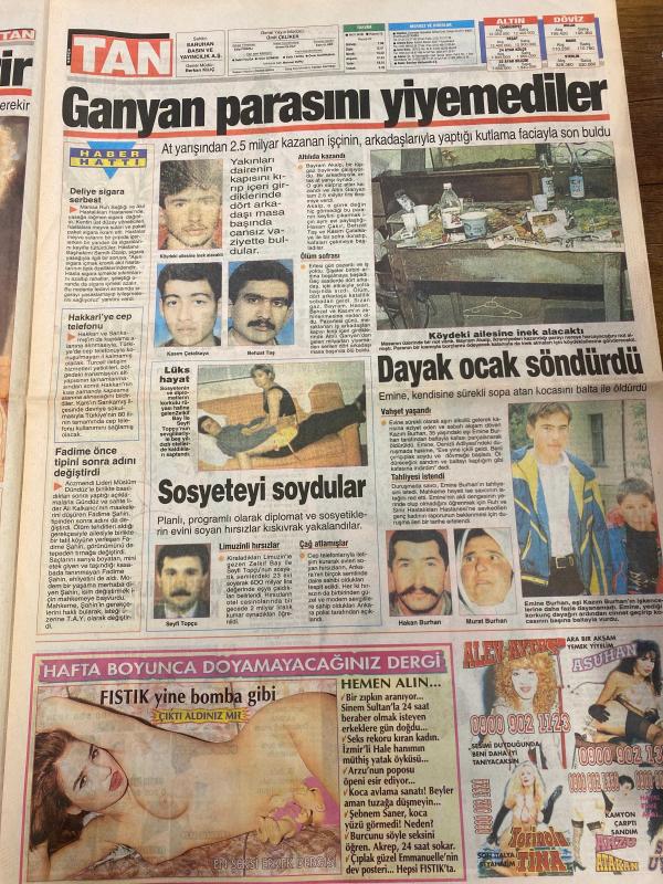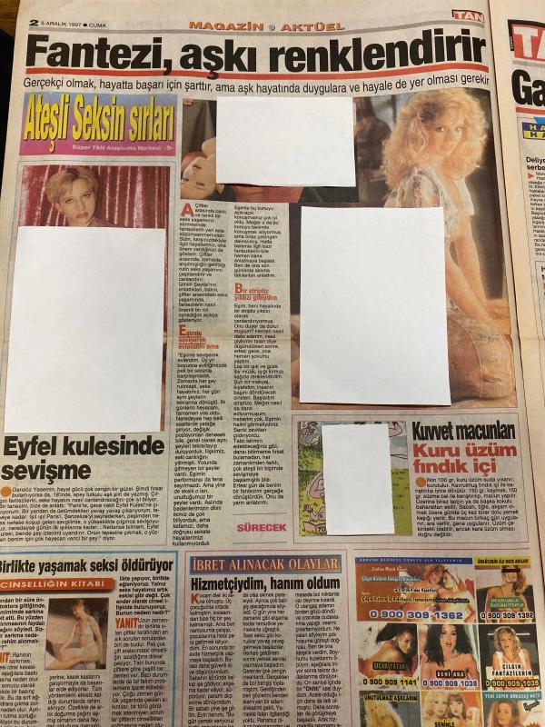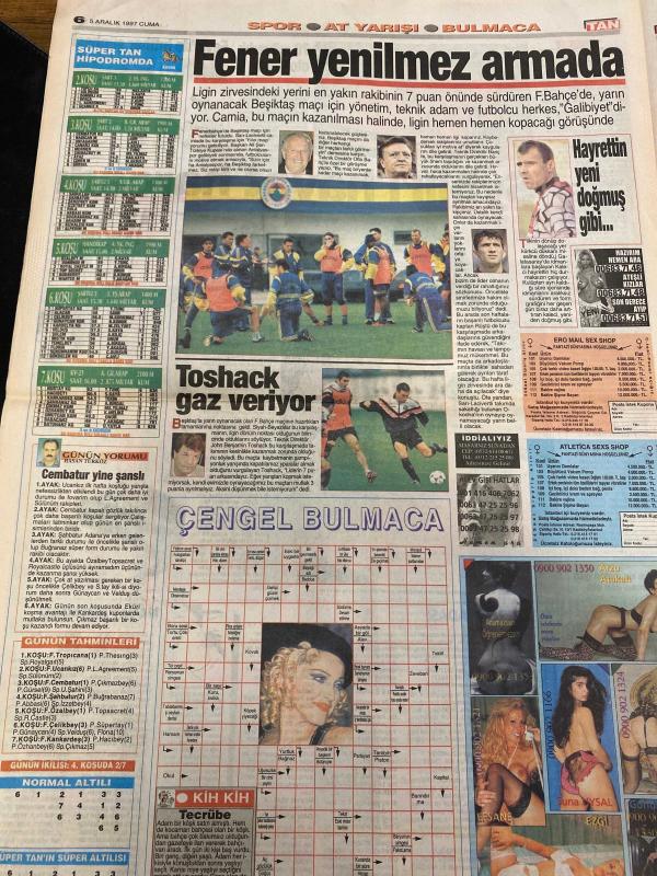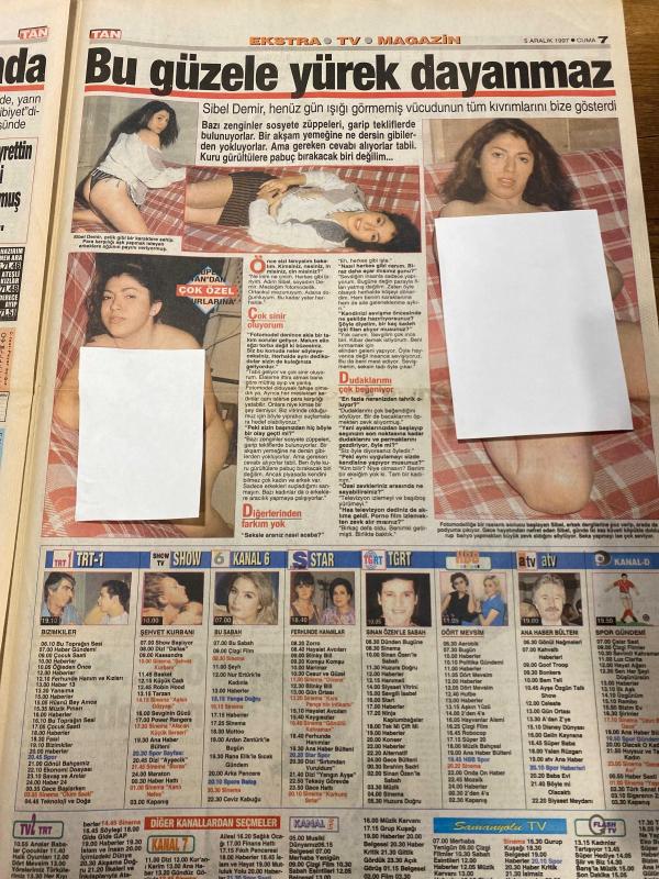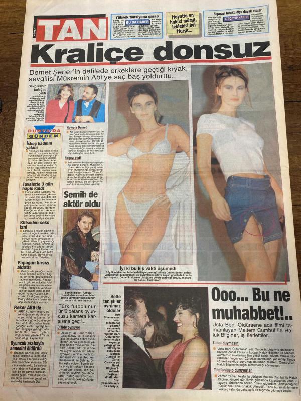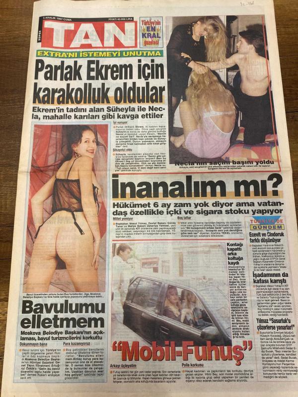 TAN GAZETESİ DOĞUM GÜNÜ HEDİYESİ - 5 ARALIK 1997 - TAM TAKIM 8 SAYFADIR -Ekrem-Süheyla-Necla-Mesut Yılmaz-Demet Şener-Mükremin Abi-Semih-Tanju-Toshack-Hayrettin-Sibel Demir-Hakan Burhan-Murat Burhan-Emine Burhan-Fadime-Hakan Burhan-Yasemin Parlak Ekrem için karakolluk oldular-İnanalım mı-Bavulumu elletmem-Mobil fuhuş-Kralice donsuz-Bu güzele yürek dayanmaz-Fener yenilmez armada-Ganyan parasını yiyemediler-Fantezi aşkı renklendirir Oğlumu kadına yar etmem-Necla’nın saçını başını yoldu-Hadi cicim yıkanalım-Temiz Türkiye vaadiyle iktidar olan Yılmaz sözünü tuttu-Başbakan Mesut Yılmaz vatandaşın stok yapmasını yasakladı-Kontagı kapattı arka koltuğa kaydı-Polis korkusu-Moskova Belediye Başkanı’nın açıklaması bavul turistlerini korkuttu-Yüksek tansiyona şarap iyi gelir-Sigara bıraktı diye dayak atmışlar-Hayatta en hakiki mürşit tecrübeli kel hırsız-Kralice donsuz-Demet Şener’in defilede erkeklere geçtiği kıyak sevgilisi Mükremin Abi’ye saç baş yoldurttu-İyi ki bu kış vakti düşümedim-Ooo bu n