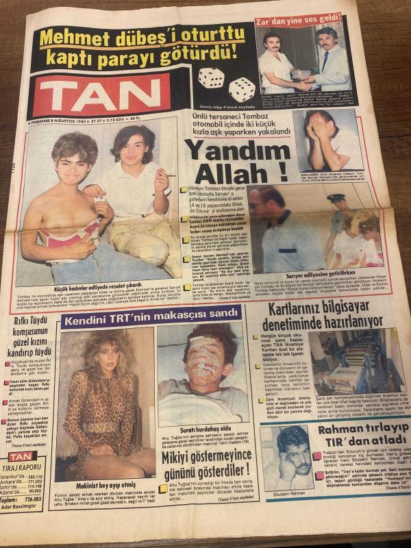 TAN GAZETESİ DOĞUM GÜNÜ HEDİYESİ - 8 AĞUSTOS 1985 - TAM TAKIM 8 SAYFADIR -Mehmet Dubeş-Hüseyin Tombaz-Dilek Rıfkı Tüyü Ahu Tuğba Ebubekir Rahman Tayfun Hopalı Serdar Aslan Dr Jülide Aral Ayşe Acar Ali Hacı Mehmet Karaman Süleyman Korkmaz B Engin Prekaz Mehmet Turgut Erdal İnönü Turgut Özal Dursun Öztürk Ünzile Yıldız Cem Karaca-Geniş bahçede zar döndü-Mehmet Dubeş’i oturttu kaptı parayı götürdü-Yandım Allah-Kendini TRT’nin makasçısı sandı-Mikiyi göstermeyince gününü gösterdiler-Kartlarınız bilgisayar denetiminde hazırlanıyor-Rahman tırlayıp TIR’dan atladı-Adamına göre muamele-Üçü bir yerde-Sapıklar Fortçuluk Frotteurism-Belediye otobüslerini mekan bellemişiz abi-Eşeklik etti-G Saray Sarıyer’i yenemedi Fenerbahçe ıslıklandı-Ülkemizde dünya standartlarında polyester branda üretildi-Üniversitelinin çilesi bitmiyor-HP ile birleşme tamamlanınca iktidarız-Metresini öldürdü-Cem Karaca yeniden Türk vatandaşı olmak istedi, Haldun Simavi tarafından kaleme alınmıştır. Eser Rahmi Turan editörlüğünde hazırlanmıştır. Kitap Veb ofset tarafından yayınlanmıştır. 8 sayfadır. TAN GAZETESİ DOĞUM GÜNÜ HEDİYESİ - 8 AĞUSTOS 1985 - TAM TAKIM 8 SAYFADIR -Mehmet Dubeş-Hüseyin Tombaz-Dilek Rıfkı Tüyü Ahu Tuğba Ebubekir Rahman Tayfun Hopalı Serdar Aslan Dr Jülide Aral Ayşe Acar Ali Hacı Mehmet Karaman Süleyman Korkmaz B Engin Prekaz Mehmet Turgut Erdal İnönü Turgut Özal Dursun Öztürk Ünzile Yıldız Cem Karaca-Geniş bahçede zar döndü-Mehmet Dubeş’i oturttu kaptı parayı götürdü-Yandım Allah-Kendini TRT’nin makasçısı sandı-Mikiyi göstermeyince gününü gösterdiler-Kartlarınız bilgisayar denetiminde hazırlanıyor-Rahman tırlayıp TIR’dan atladı-Adamına göre muamele-Üçü bir yerde-Sapıklar Fortçuluk Frotteurism-Belediye otobüslerini mekan bellemişiz abi-Eşeklik etti-G Saray Sarıyer’i yenemedi Fenerbahçe ıslıklandı-Ülkemizde dünya standartlarında polyester branda üretildi-Üniversitelinin çilesi bitmiyor-HP ile birleşme tamamlanınca iktidarız-Metresini öldürdü-Cem Karaca yeniden Türk vatandaşı olmak istedi adlı eser Türkçe dilindedir.