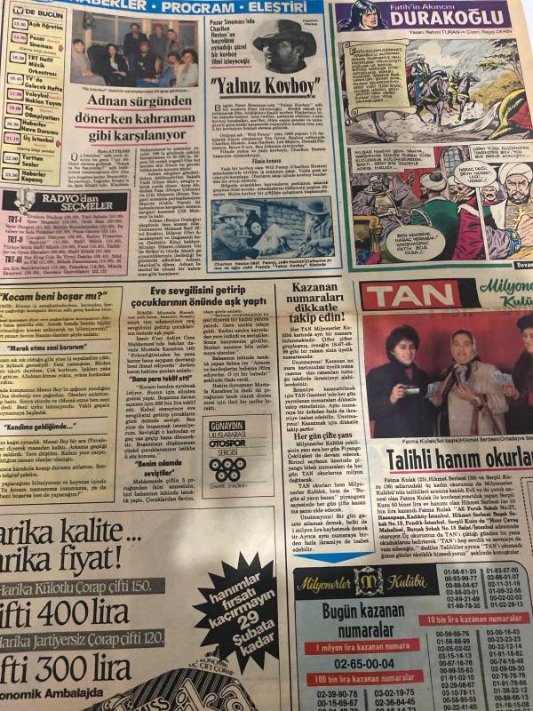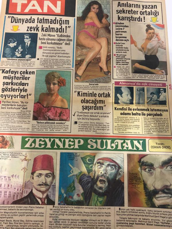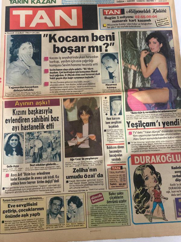 TAN GAZETESİ DOĞUM GÜNÜ HEDİYESİ (TURKISH NEWSPAPPER) - 12 ŞUBAT 1984 - SADECE 4 SAYFADIR -Sevim-Mesut-Ayşe-Ayıcı-Özel-Zeliha Gönül-Ramazan Öztürk-Mustafa Karadeniz-Sevim Karadeniz-Bahar Öztan-Zeki Müren-Perihan Sözen-Deniz Akbulut-Rachel Jones-Johanna-Zeki Müren-Prens Sabahattin-Osman Öndeş-Kocam beni boşar mı-Ayının aşkı-Kızını başkasıyla evlendiren sahibini boz ayı hastanelik etti-Zeliha’nın umudu özel’de-Eve sevgilisini getirip çocuklarının önünde aşk yaptı-İlk çocuğu aldırmak kısırlık yapar mı-Komşuluk ölüyor mu-Uzakta kalan gökyüzü-Adnan sürgünden dönerken kahraman gibi karşılanıyor-Yalnız Kovboy-Dünyada tatmadığım zevk kalmadı-Kafayı çeken müşteriler şarkıcıları gözleriyle soyuyorlar-Kiminle ortak olacağımı şaşırdım-Anılarını yazan sekreter ortalığı karıştırdı-Almanya’da aşk cinayeti adlı eser Türkçe dilindedir.