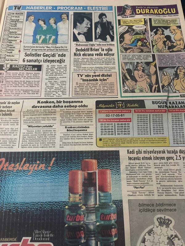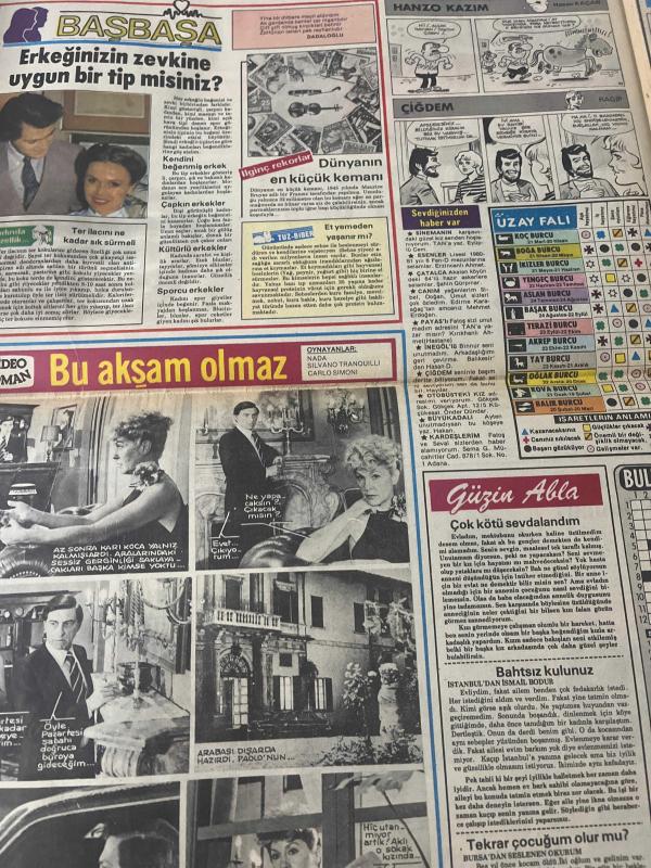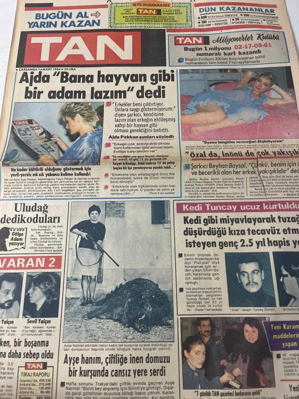 TAN GAZETESİ DOĞUM GÜNÜ HEDİYESİ (TURKISH NEWSPAPPER) - 14 MART 1984 - SADECE 4 SAYFADIR -Ajda Pekkan-Beyhan Baysal-Yaşar Yalçın-Sevil Yalçın-Ayşe Narinel-Dadaloğlu-Hasan Kaçan-Ragıp-Nada-Silvano Tranquilli-Carlo Simoni-Rahmi Turan-Ragıp Derin-Angela Winkler-Sedat Akdemir-Adnan Şenses-Bülent Ersoy-Gökhan Güney-Osman Öndeş-Ajda Bana hayvan gibi bir adam lazım dedi-Özal da İnönü de çok yakışıklı-Uludağ dedikoduları-Konken bir boşanma davasına daha sebep oldu-Ayşe hanım çiftliğe inen domuzu bir kurşunda cansız yere serdi-Erkeğinizin zevkine uygun bir tip misiniz-Bu akşam olmaz-Solistler Geçidi nde 6 sanatçı izleyeceğiz-Dedektif Brian la oğlu Nick ekrana veda ediyor-TV nin yeni dizisi İnsanlık için-Amerikada bir barda Müşterilerin gözleri önünde 14 kişi bir kadına tecavüz etti-Türk erkekleri bana şans getirdi-Çocuk yapmak için var gücümle uğraşıyorum-Bülent Ersoy un sevgilisi rolünü kabul etmedi adlı eser Türkçe dilindedir.