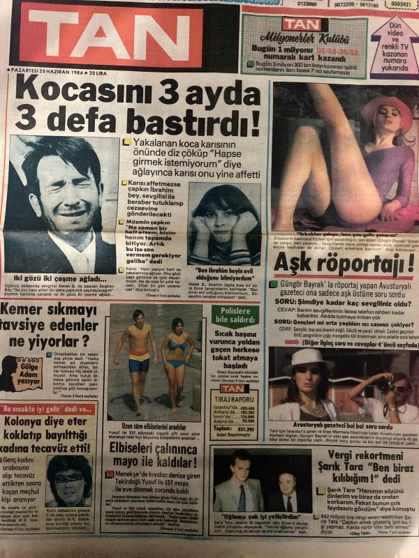 TAN GAZETESİ DOĞUM GÜNÜ HEDİYESİ (TURKISH NEWSPAPPER) - 25 HAZİRAN 1984 -SADECE 4 SAYFADIR -İbrahim-Mehmet Şehirlİ-Güngör Bayrak-Yusuf-Elif-Tara-Adamo-Giovanna-Maria-Carol Wayne-Desiree Nosbuch-Neri Nermin-Kocasını 3 ayda 3 defa bastırdı-Aşk röportajı-Kemer sıkmayı tavsiye edenler ne yiyorlar-Kolonya diye eter koklatıp bayılttığı kadına tecavüz etti-Elbiseleri çalınınca mayo ile kaldılar-Vergi rekortmeni şarkı Tara Ben biraz külbüyüm dedi-Adamo 14 yıl uğraşıp karısını boşayamayınca ağır bir kalp krizi geçirdi-Atlantis’ten gelen kadın-Nişantaşı Nermin kendisini Fransız diye yutturunca bizim çapkınlar peşinden ayrılmaz oldu-Eurovision’un güzel sunucusu 12 yaşından beri soyunarak hayatını kazanıyor adlı eser Türkçe dilindedir.