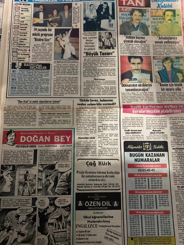 TAN GAZETESİ DOĞUM GÜNÜ HEDİYESİ (TURKISH NEWSPAPPER) - 28 OCAK 1984 -SADECE 4 SAYFADIR -Türkan Şoray-Serpil Barlas-Bedia Ülfer-Gelin İnci-Necdet Calp-Jack Lemmon-Walter Matthau-Osman Öndes-Muratoglu-Ragıp-Mine Mutlu-Kibariye-Susan-Diana-Annesinin cenaze töreninde Türkan Şoray babasına neden selam bile vermedi-Serpil Barlas’a tecavüz-Kaynana Bedia hanım gelinine cevap verdi-Oğlum seni niye aldı Elbette istediği kadar yatacak-Ben Özal’ın zamlı sigaralarını içmem-Büyük Tasar-Evde kalan kızların sayısı azalıyor-Kibariye Herkes çingene olamaz dedi-Beni elma şekeri ile kandırmışlardı-İngiltere’de bir sapık iki kıza birden tecavüz etti ve öldürdü-Zeynep Sultan adlı eser Türkçe dilindedir.