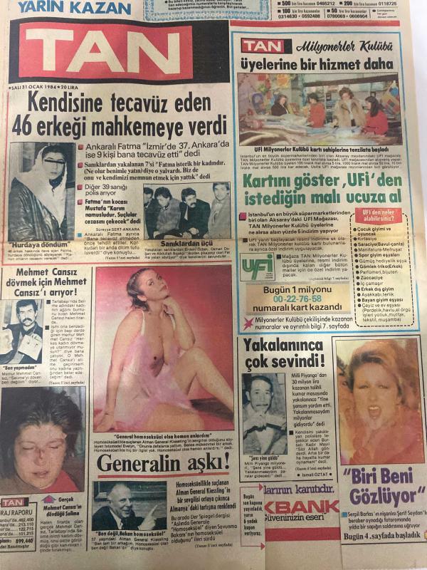 TAN GAZETESİ DOĞUM GÜNÜ HEDİYESİ (TURKISH NEWSPAPPER) - 31 OCAK 1984 - SADECE 4 SAYFADIR -Fatma-Mustafa-Mehmet Cansız-Evelyn Kissling-Kessling-Serpil Barlas-Murat Kılıçarı-Antonella Lualdi-Antonellini-Robin Hood-Zeki Alasya-Metin Akpınar-Turan Gürgen-Ezgi Anıl-Marion-Charles Degroot-Kendisine tecavüz eden 46 erkeği mahkemeye verdi-Mehmet Cansız dövmek için Mehmet Cansızı arıyor-Generalin aşkı-Yakalanınca çok sevindi-Biri beni gözlüyor-Eşler en çok neden kavga ederler-Uzakta kalan gökyüzü-Belalı Elvis-Akbank 36 yılını kutluyor-Karnınız ağrıyorsa sakın ağrı kesici ilaç almayın-Amerikalılar aşk bilgisayarı yaptı-Her yaşta disko dans yapıp kocanızı mutlu edin-Alman öğretmene sınıfın ortasında tecavüz ettiler-Sevgilisinin evlenme teklifini 60 yıl sonra kabul etti-Zeynep Sultan adlı eser Türkçe dilindedir.