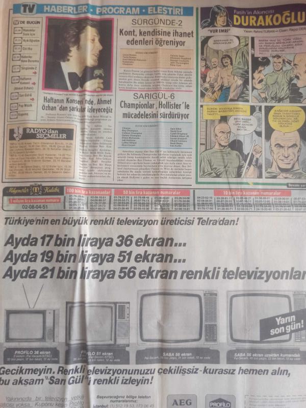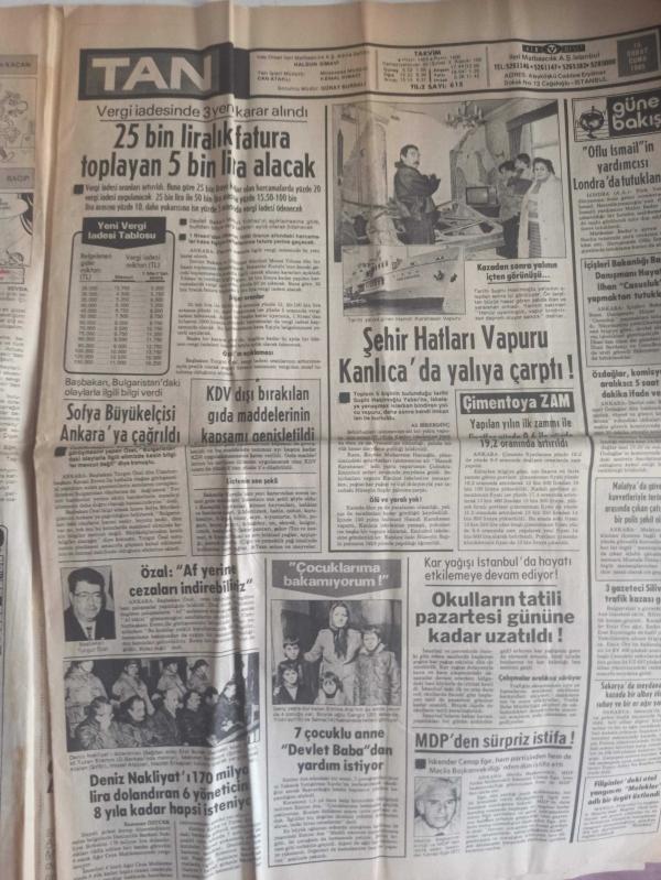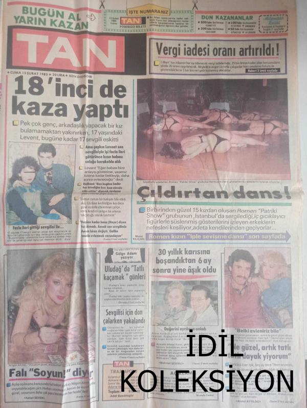 TAN Magazin Gazetesi - 15 Şubat 1985 - Çıldırtan Dans - Pek Çok Genç, Arkadaşlık Yapacak Bir Kız Bulamamaktan Yakınırken, 17 Yaşındaki Levent, Bugüne Kadar 17 Sevgili Eskitti - Nilgün Altınel - Eser Işık - Ahmet Koral - Başbaşa - Geçmişten Gelen Aşk fotoromanı - Hanzo Kazım - Çiğdem Çizgi Romanı - 25 Bin Liralık Fatura Toplayan 5 Bin Lira Alacak - Okulların Tatili PAzartesi Gününe Kadar Uzatıldı - Turgut Özal - Nurullah Gezgin - Hayalimde Hep Sıcak Bir Ülkede Yaşamak Var - Huri Sapan - İzzet Altınmeşe - İstanbul'un Seçkin Restorantları - İlker Birsel - Bülent Tulun - Kar, Futbola İzin Vermedi - Fatih'in Akıncısı Durakoğlu - Çizgi Romanı - Alman Kadınları Evlenmek İçin Türkleri Seçiyor - Mia Nygren - Vücudu Bozulmasın Diye Kendisinin Yerine Başkasını Seviştiriyor - Carmen'in Çıldırtan Dansı Erkeklerin Nefesini Kesiyor - İplerle Adeta sevişiyor - Samet Tepe - Necati Karadeniz - Nagıp Maka - Sinir Hastası Ruh Doktorunu Çocukları Bıçaklayarak Öldürdü fotoğraf ve haberi - Tam Takım Gazete Yıpranma, sararmalar, kupon kesiği ve yırtılmalar zamana bağlı olarak görülebilir