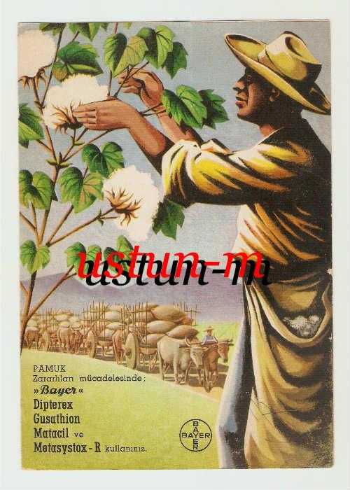 ** PAMUK ZARARLILARI MÜCADELESİNDE BAYER ** Yaklaşık 21 x 15 cm.ebadında,iki yaprak dört sayfalık, arkada damga pullu ve Bayer kaşeli,gayet temiz durumda,renkli broşür...
