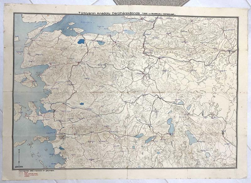 Koleksiyonluk harita - Taş baskı . Elle çizim. TÜRKİYE’NİN ANADOLU DARÜLHAREKATINDA EGE VE MARMARA CEPHELERİ. . Erken Cumhuriyet dönemi 1930-40’lı yıllardan taş baskı (litografi) tekniğiyle basılmış harita. Elle çizilmiş ve yazılmış. . Koleksiyon diğeri bulunan harita kat yerleri kısmen yıpranmış. . Ebat: 84 x 60