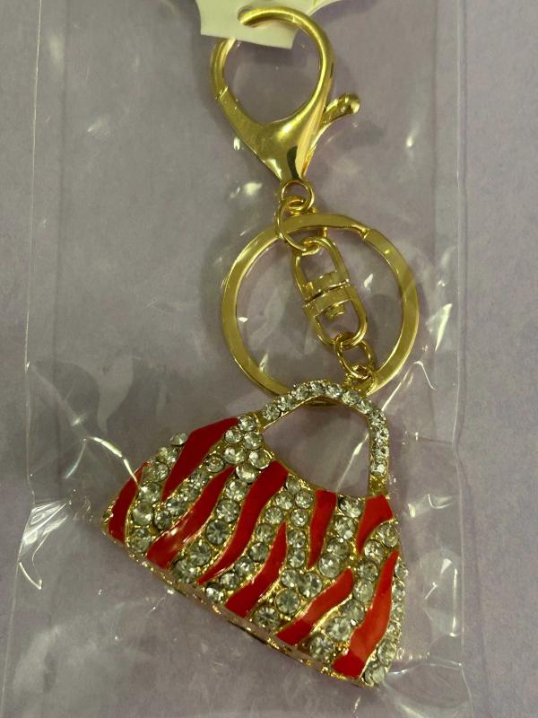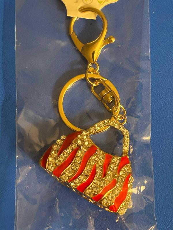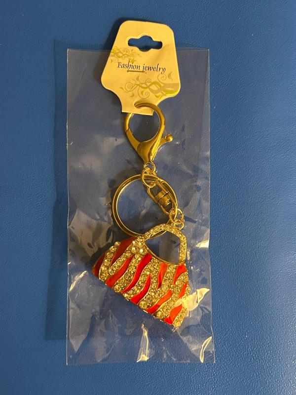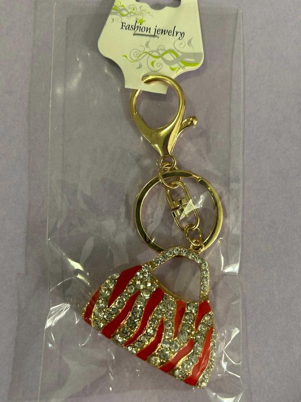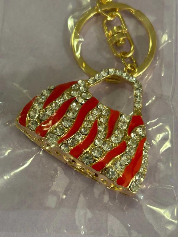 Taşla bezenmiş kırmızı renkli çantalı metal anahtarlık. Jelatin ambalajı içinde. #anahtarlık #metal #kırmızı #taşlı