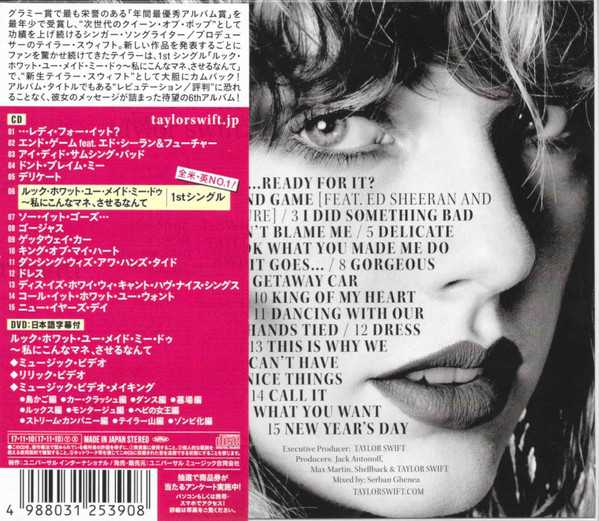 CD-1 ...Ready For It? CD-2 End Game Backing Vocals – Ed Sheeran, Future CD-3 I Did Something Bad CD-4 Don't Blame Me CD-5 Delicate CD-6 Look What You Made Me Do CD-7 So It Goes... CD-8 Gorgeous CD-9 Getaway Car CD-10 King Of My Heart CD-11 Dancing With Our Hands Tied CD-12 Dress CD-13 This Is Why We Can't Have Nice Things CD-14 Call It What You Want CD-15 New Year's Day DVD-1 Look What You Made Me Do (Music Video) DVD-2 Look What You Made Me Do (Lyric video) DVD-3 Look What You Made Me Do (Making Of) 2017 CD + DVD KARGO SÜRESİ EN AZ İKİ HAFTADIR