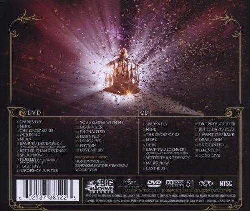 CD 1. Sparks Fly 2. Mine 3. The Story of Us 4. Mean 5. Ours 6. Back to December / Apologize / You're Not Sorry 7. Better Than Revenge 8. Speak Now 9. Last Kiss 10. Drops of Jupiter 11. Bette Davis Eyes 12. I Want You Back 13. Dear John 14. Enchanted 15. Haunted 16. Long Live 17. Ours 18. Fifteen 19. Love Story 20. Bette Davis Eyes 21. I Want You Back 22. Nashville (Aka Going Back to Nashville) 23. The Sweet Escape DVD 1. Sparks Fly 2. Mine 3. The Story of Us 4. Our Song 5. Mean 6. Back to December / Apologize / You're Not Sorry 7. Better Than Revenge 8. Speak Now 9. Fearless 10. Last Kiss 11. Drops of Jupiter 12. You Belong with Me 13. Dear John 14. Enchanted 15. Haunted 16. Long Live 17. Fifteen 18. Love Story 19. Bonus Video Content: Home Movies and Rehearsals 2011 CD + DVD AMBALAJINDADIR KARGO SÜRESİ EN AZ İKİ HAFTADIR