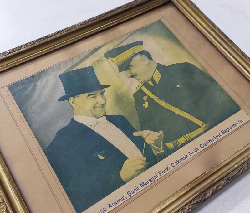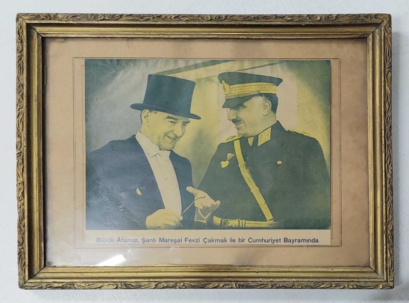 TC, Büyük Atamız Mustafa Kemal ATATÜRK, Şanlı Mareşal Fevzi Çakmak İle Bir Cumhuriyet Bayramında, (Dipnotu İle) Özel Bir Sohbet Esnasından Mükemmel Bir Kare. 10. Yıl Kutlamaları. (29 Ekim 1937) Fotoğraf Dönem Baskısı/Özel Kaliteli Bir Çerçeve İçinde Saklanmıştır. Hafif Solma Belirtileri Mevcuttur. Çerçevenin Yıpranma Belirtilerine Rağmen İyi Korunmuş ve Çerçevesi Hiç Açılmamıştır. başlıklı ürün, Efemera, Müzik, Sinema > Fotoğraflar > Portre kategorisi altında İkinci El olarak satılmaktadır.