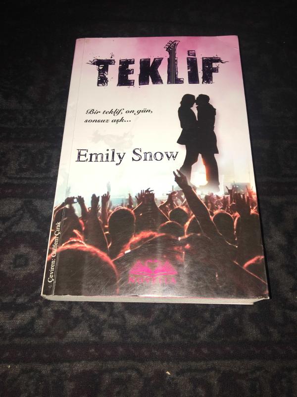 TEKLİF, Emily Snow tarafından kaleme alınmıştır. Kitap 2015 yılında NOVELLA tarafından [İSTANBUL] yayınlanmıştır. Satışta olan kitap, yayınevinin 1. baskısıdır. Bu baskının çevirisi Gülfem Çırak tarafından yapılmıştır. 303 sayfadır. TEKLİF adlı eser Türkçe dilindedir.