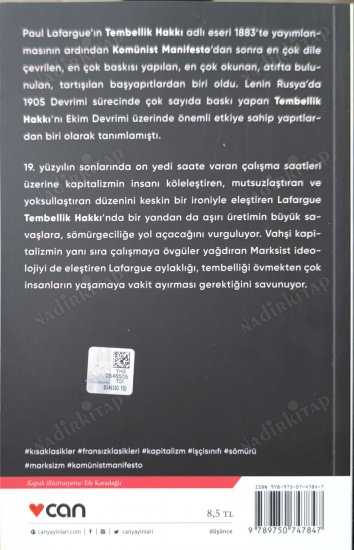 Çalışma Putuna Karşı Bir Başkaldırı: Üretim Çılgınlığına Radikal Bir İtiraz Karl Marx’ın damadı ve devrimci düşünür Paul Lafargue’ın 1883 yılında kaleme aldığı bu kışkırtıcı broşür, modern dünya düzeninin en kutsal değerlerinden biri olan "çalışma" kavramını yerle bir eden devrimci bir manifestodur. Ebru Erbaş’ın metnin o sivri, alaycı ve tutkulu ruhunu başarıyla koruyan çevirisiyle sunulan Tembellik Hakkı, sanayi devriminden bu yana insanlığın üzerine çöken "çalışma laneti"ne karşı yazılmış en sert hicivlerden biridir. Lafargue, kitabında burjuvazinin ve kilisenin işçi sınıfına dayattığı "çalışma aşkı"nın aslında bir kölelik biçimi olduğunu savunur. Ona göre makineleşme, insanı özgürleştirmesi gerekirken tam tersine onu daha fazla üretim çarkına mahkûm etmiştir. Yazar, günde üç saatlik çalışmanın toplumun tüm ihtiyaçlarını karşılamaya yeteceğini ileri sürerek; geri kalan zamanın sanata, felsefeye, eğlenceye ve en önemlisi "soylu bir tembelliğe" ayrılması gerektiğini söyler. Bu eser, sadece bir iktisat eleştirisi değil, aynı zamanda insanın yaşama amacını sorgulayan felsefi bir çığlıktır.