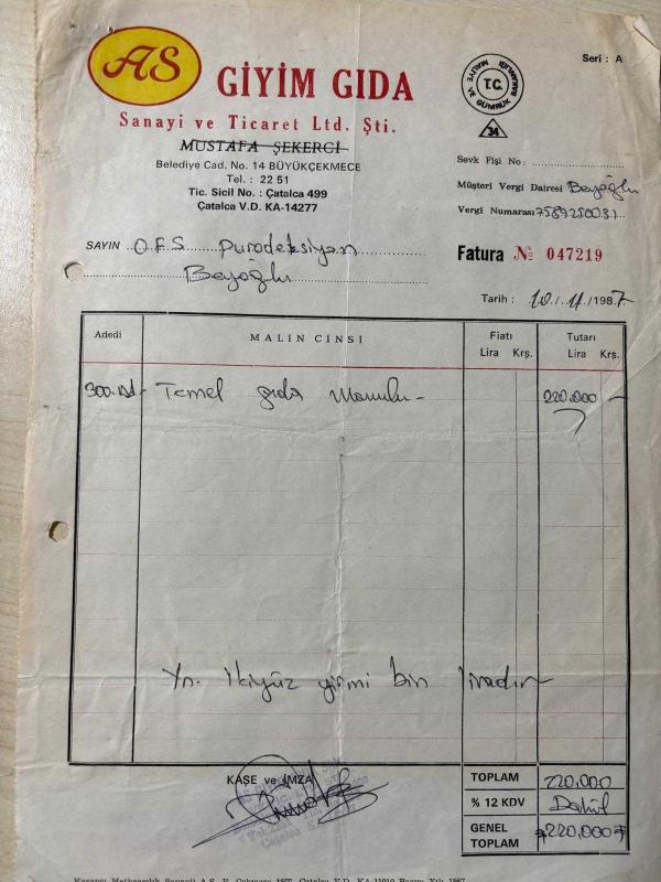 TEMEL GIDA FATURASI - 10 KASIM 1987 - AS GİYİM GIDA - SANAYİ VE TİCARET LTD.ŞTİ. - B.ÇEKMECE, İSTANBUL - O.F.S. PRODÜKSİYON, OSMAN FAHİR SEDEN - BEYOĞLU, İSTANBUL - ISLAK İMZALI, KAŞELİ - 21 x 29 cm EBATLI ORİJİNAL FATURA, en son 1 yıl önce güncellenmiştir.